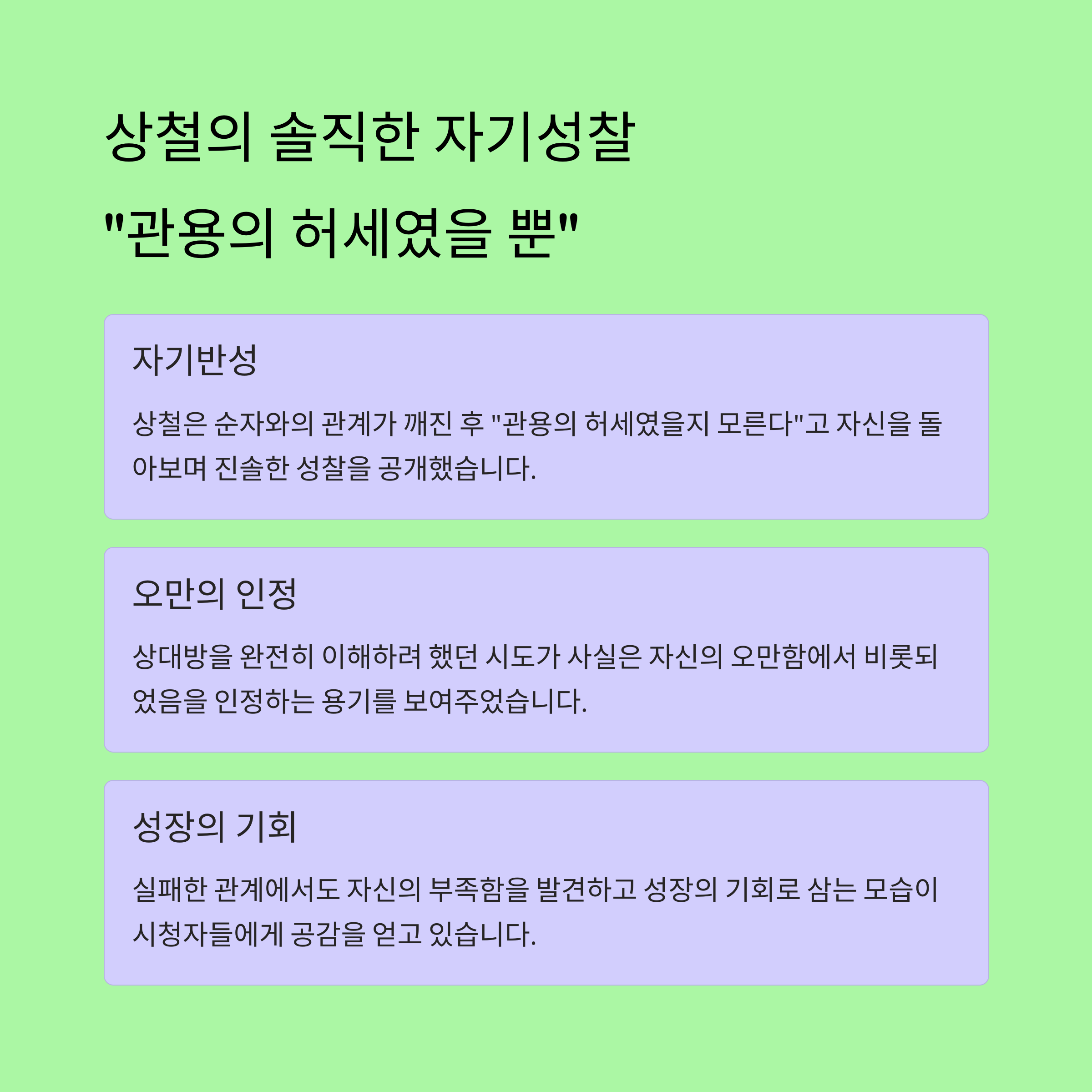 | “관용의 허세였을지 모른다” | 상철 | 자기반성과 감정의 복잡성 고백 |
