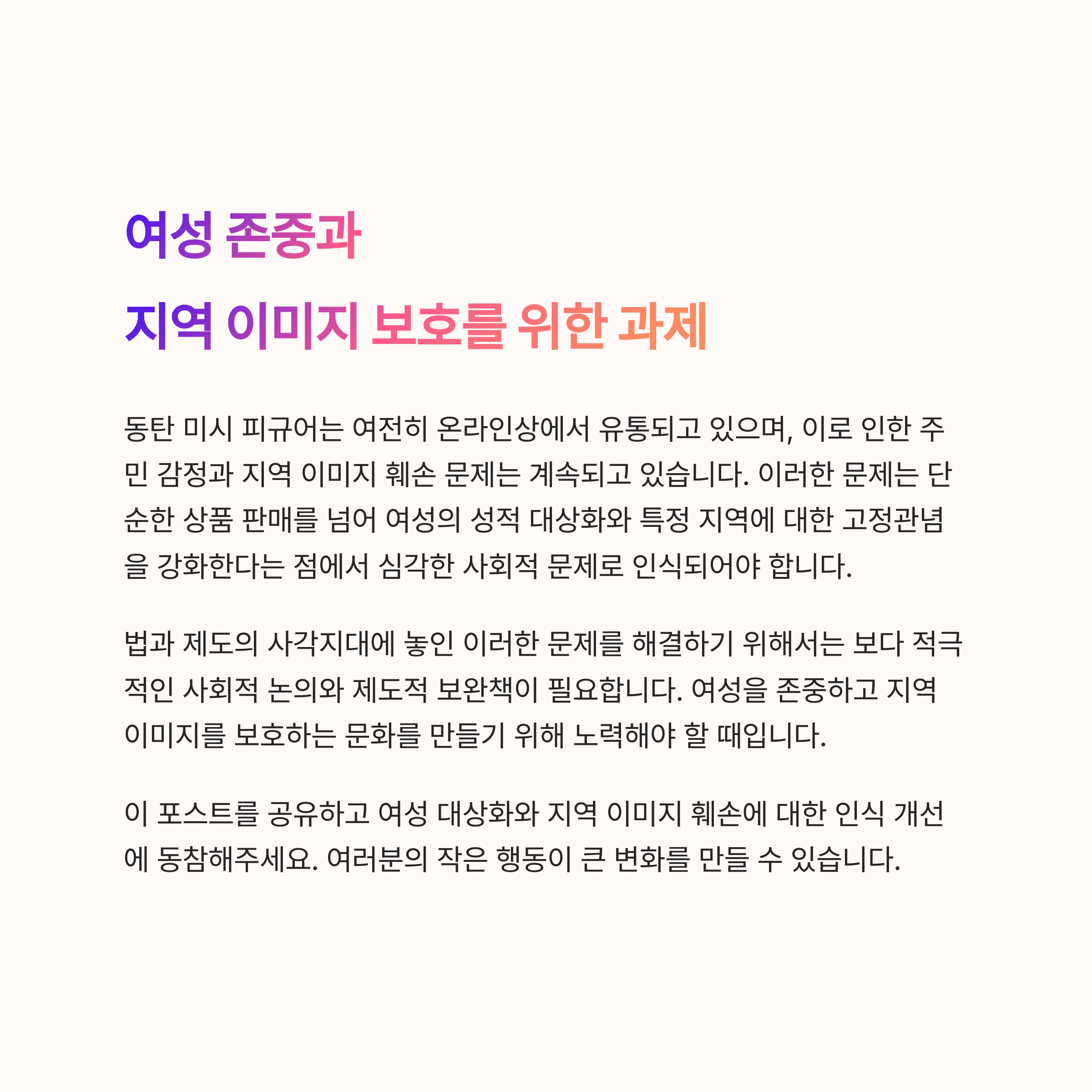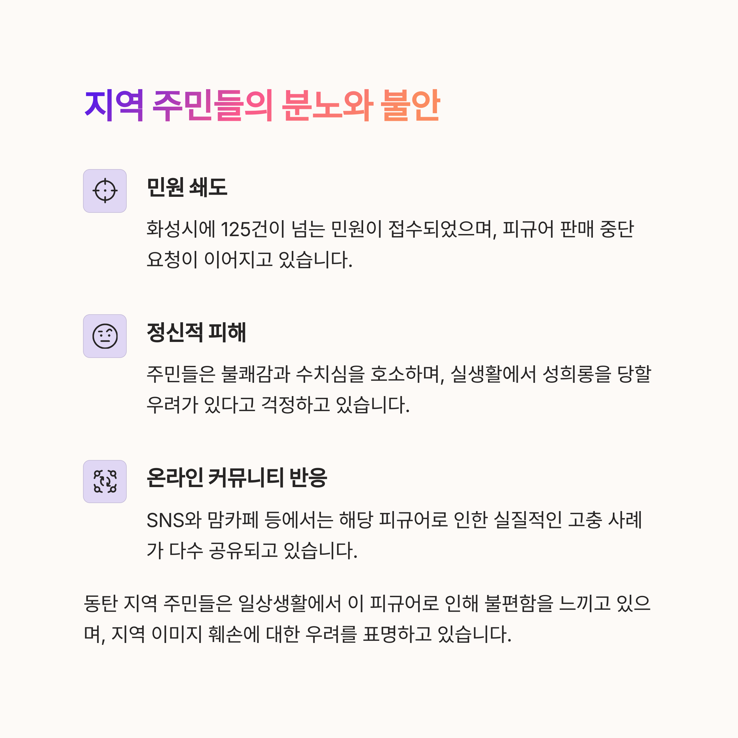피규어 자체가 성적 상징을 부각한 디자인인 데다, 그 이름에 ‘동탄’이라는 지역명이 함께 쓰이면서 논란은 더욱 확산되었습니다. 특히 실제 동탄 지역에 거주 중인 여성들 사이에서는 “불쾌한 질문을 받는다”, “우리 지역이 희화화됐다”는 불만이 커졌습니다. 이는 단순한 밈 소비를 넘어, 지역 사회와 특정 계층에 대한 왜곡된 시선을 대중 콘텐츠가 유포할 수 있다는 점에서 경각심을 일으킵니다. 실제로 지역 커뮤니티에는 불쾌감, 수치심, 성희롱 피해 우려를 호소하는 글들이 잇따르고 있습니다.