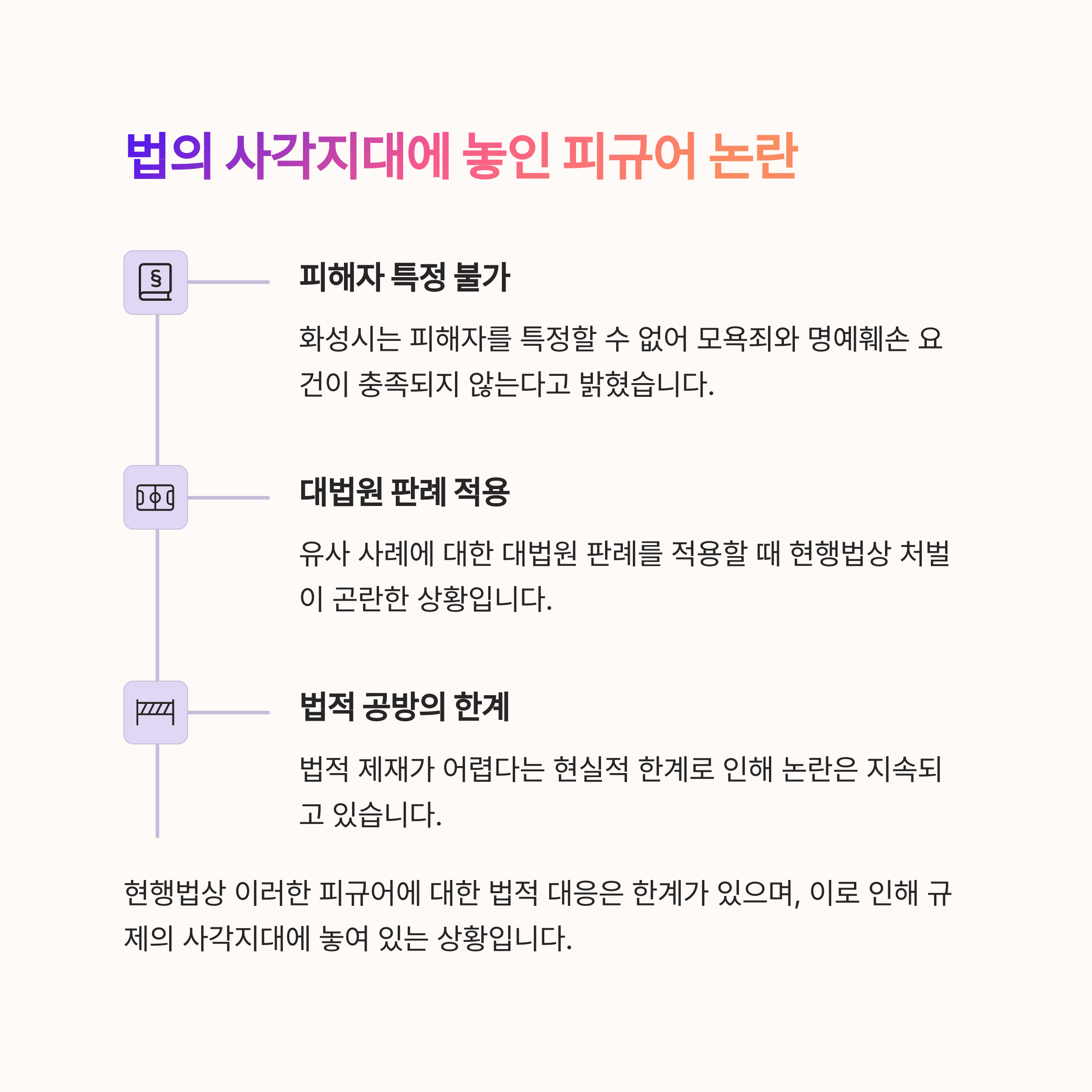 모욕죄나 명예훼손은 특정 피해자가 명확해야 하며, 일반적인 표현에는 적용이 어렵다는 게 현재 법률의 한계입니다.