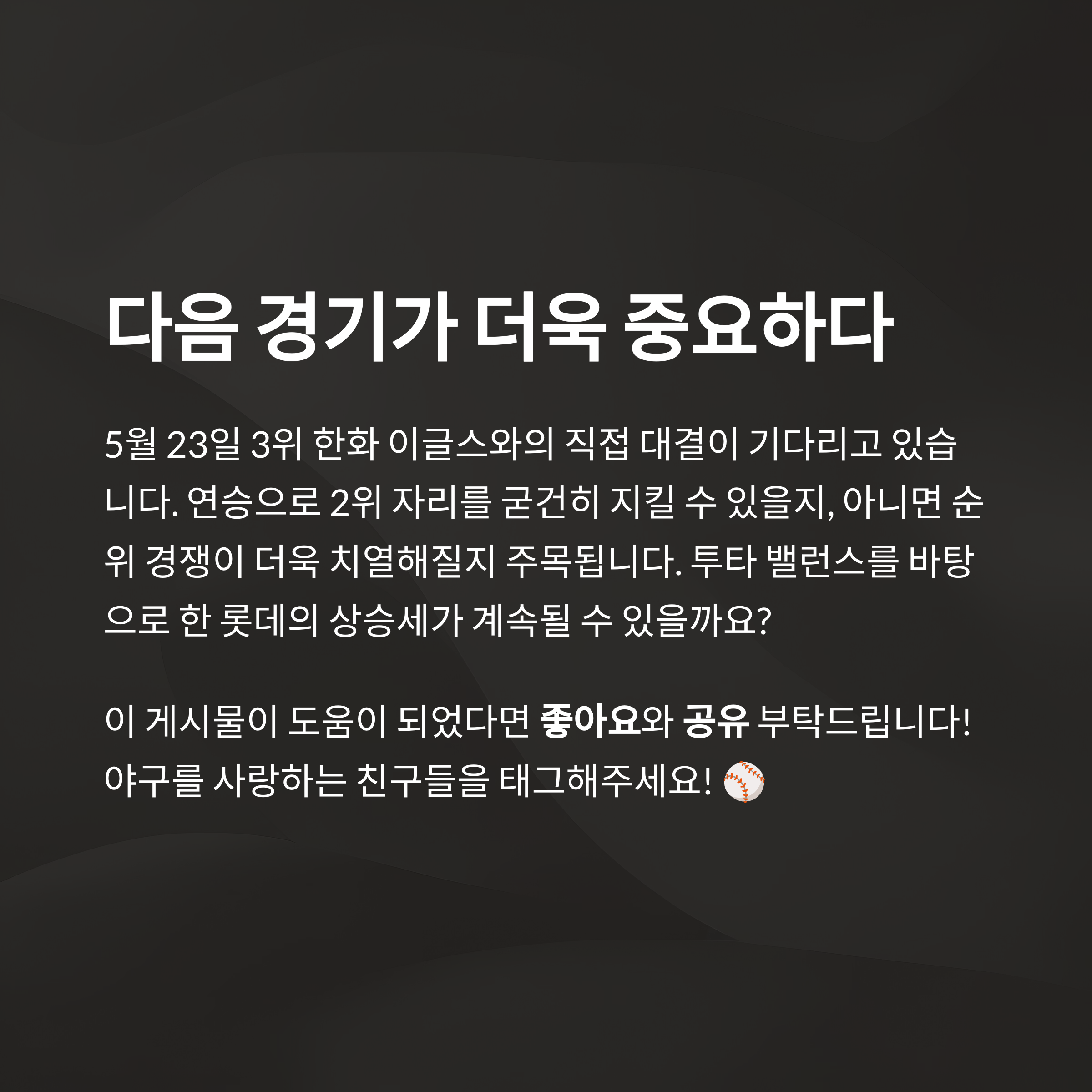 2위 롯데와 3위 한화의 맞대결이라는 점입니다. 승리 팀이 중상위권 구도를 주도하게 되며, 치열한 타선 싸움이 예고됩니다.
