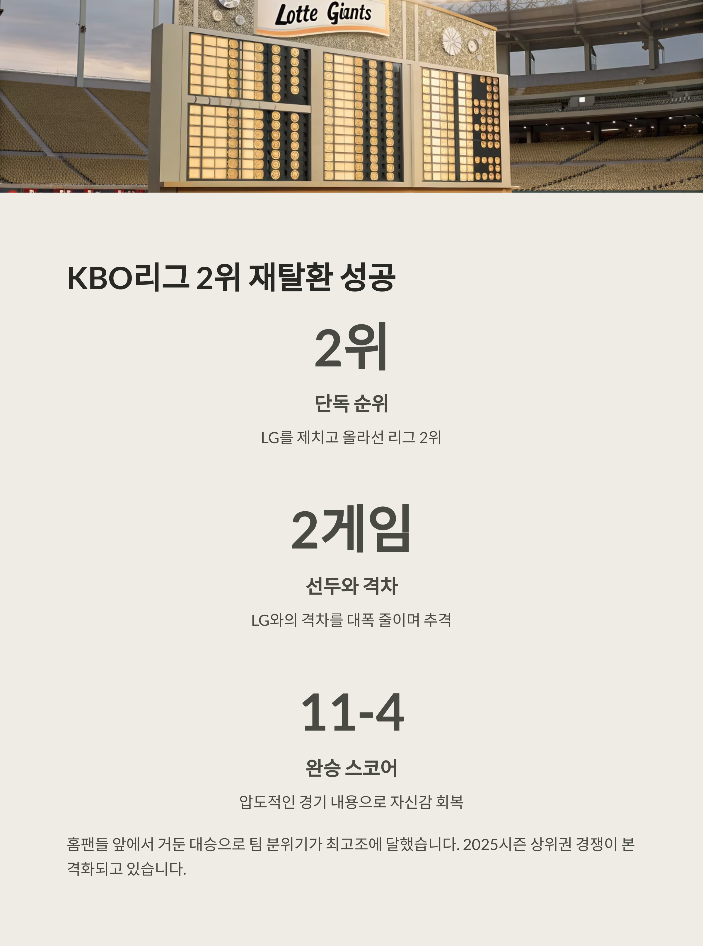 이번 LG전 대승은 단순히 승수 하나를 더한 것이 아닙니다. 롯데는 2위로 올라서며 상위권 구도에 본격적으로 뛰어든 팀이 되었습니다. 중심 타선에만 의존하지 않고 고른 타선 분포, 새롭게 떠오른 리드오프 장두성, 그리고 이민석이라는 새 얼굴의 가능성까지. ‘2위 경쟁자’라는 수식어가 더 이상 과하지 않은 팀이 되었죠.