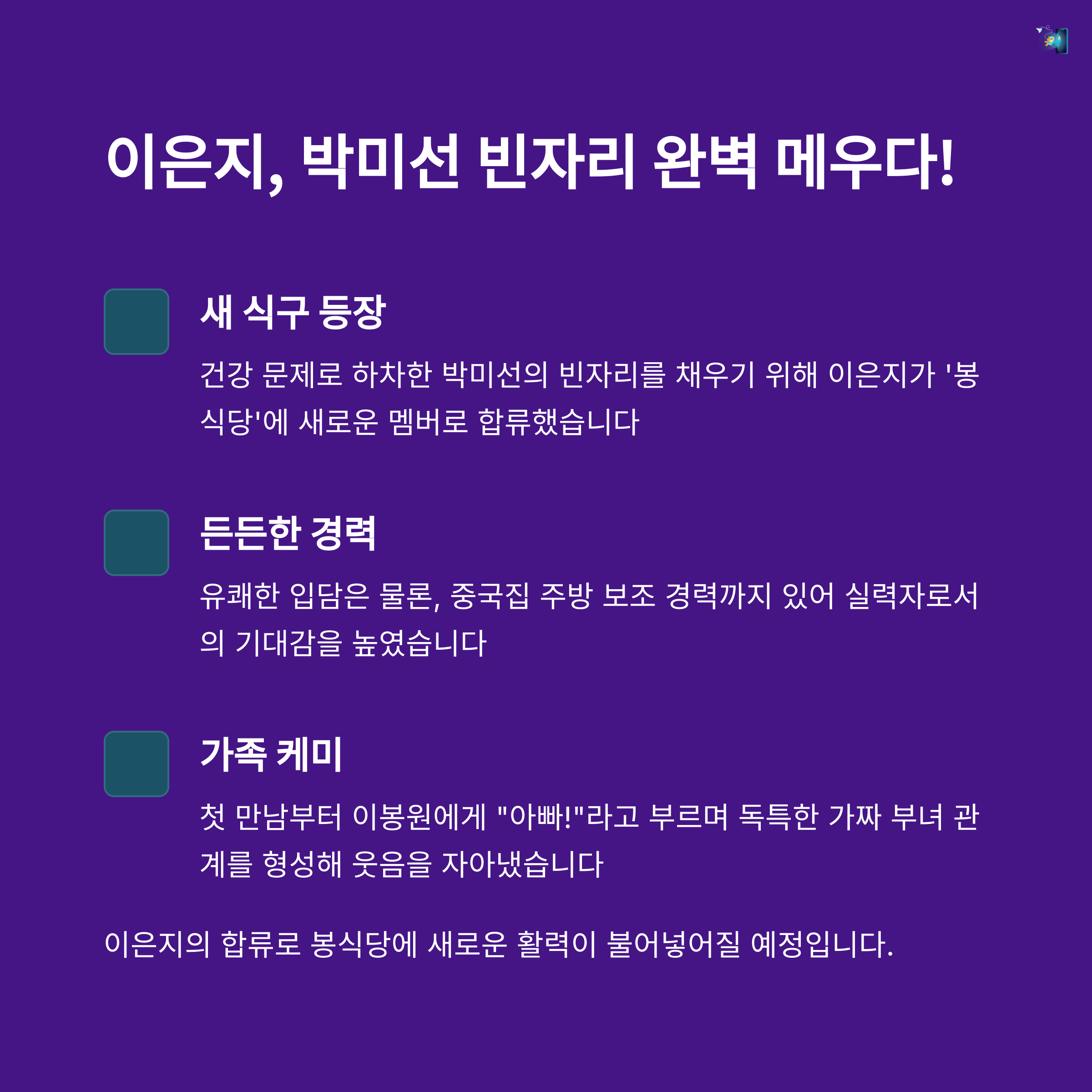 물론이죠! 본격적인 주방 운영과 갈등 조정 역할까지 맡게 되면서 중심 멤버로 자리잡을 가능성이 커요.