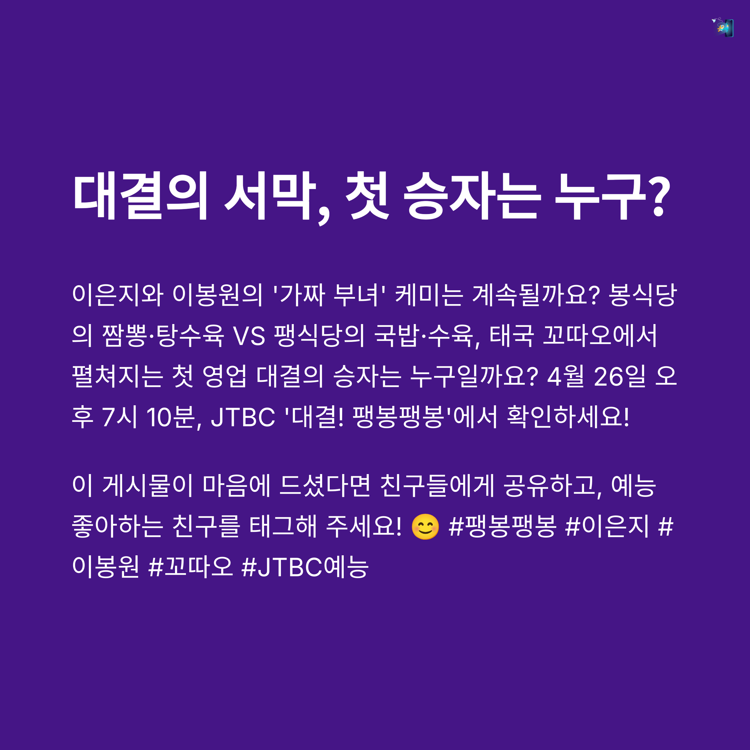 안녕하세요! 오늘은 요즘 입소문 타고 있는 JTBC 예능 ‘대결! 팽봉팽봉’에 대해 이야기해볼까 해요. 특히 1회 방송부터 시선을 사로잡은 건 바로 개그우먼 이은지 씨의 활약! 첫 등장부터 “아빠!”를 외치며 이봉원을 당황시킨 그 센스, 진짜 웃기더라고요. 게다가 이 프로그램, 촬영지가 무려 태국의 아름다운 섬 꼬따오(Koh Tao)라는 거, 알고 계셨나요? 오늘은 이은지의 활약과 함께 ‘팽봉팽봉’의 배경지, 프로그램 정보까지 싹 다 정리해드릴게요.