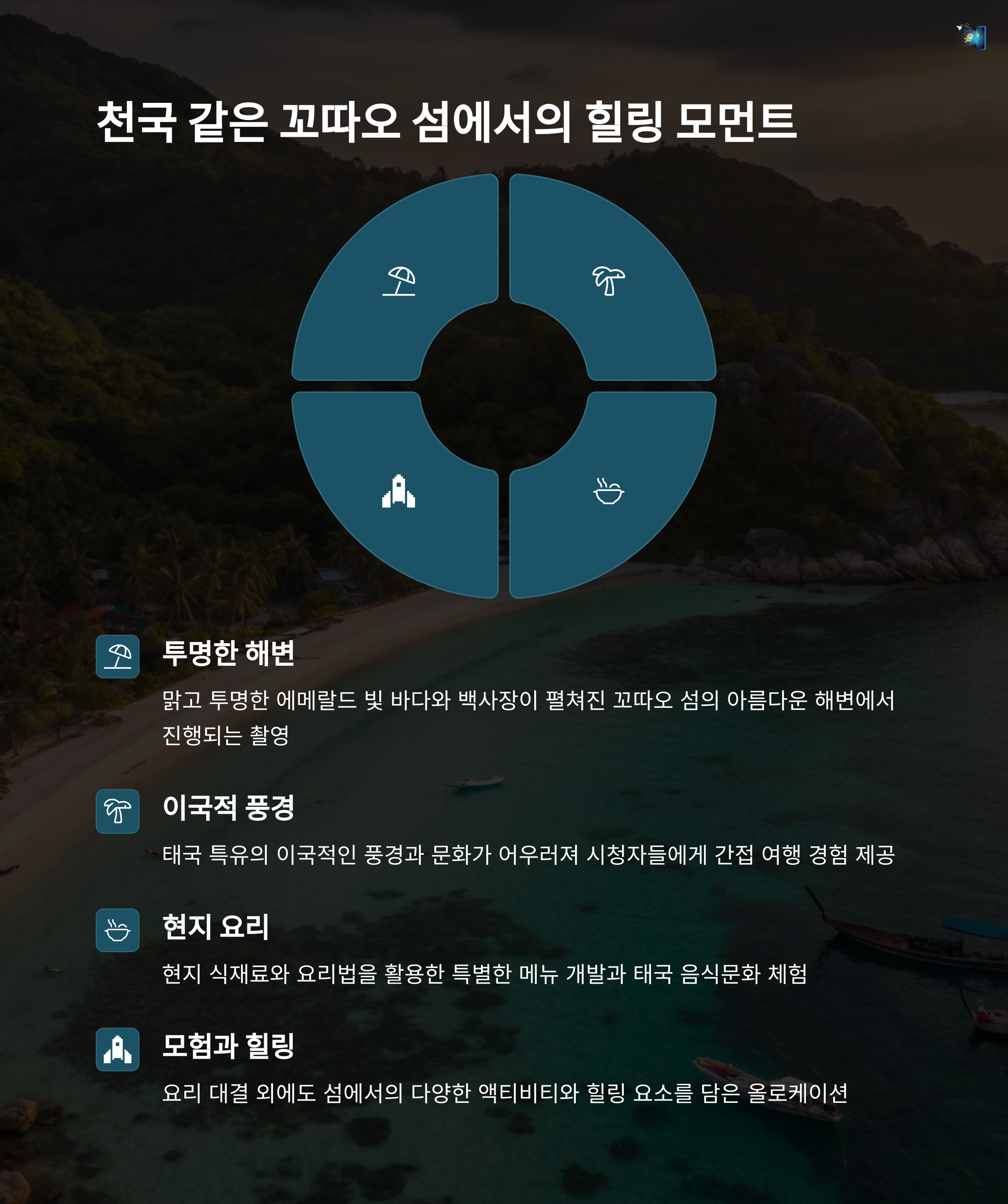 매 장면마다 비치는 코발트 블루빛 바다, 햇살 아래 반짝이는 야자수들, 그리고 저녁 노을 속에서 펼쳐지는 부부들의 갈등과 협력은 예능 그 이상의 감동을 선사하죠.