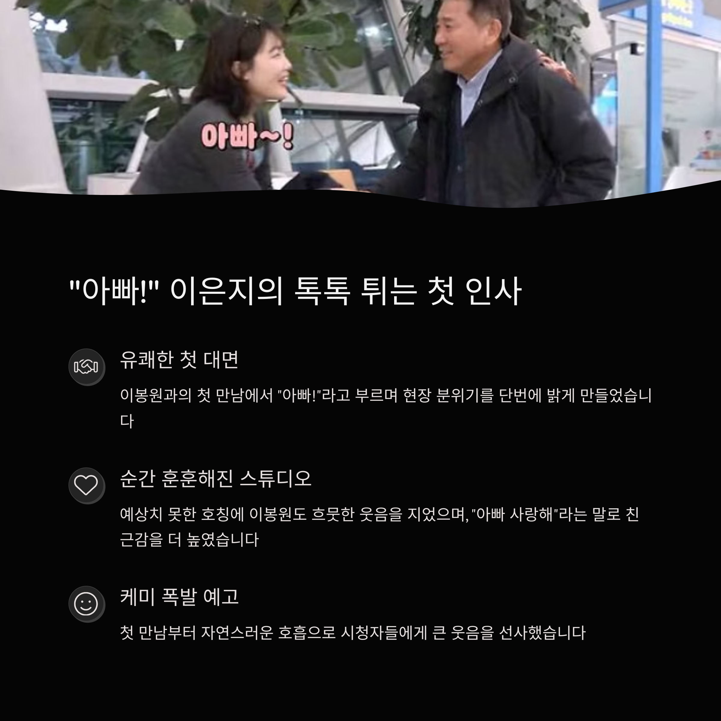 첫 회부터 시선을 사로잡은 장면, 바로 이은지가 이봉원을 향해 “아빠!”라고 부르며 등장한 순간이었죠. 그 한마디에 이봉원은 당황 반, 웃음 반. 이은지 특유의 예능 센스는 단순한 유머를 넘어 현장의 분위기까지 단숨에 장악했습니다.