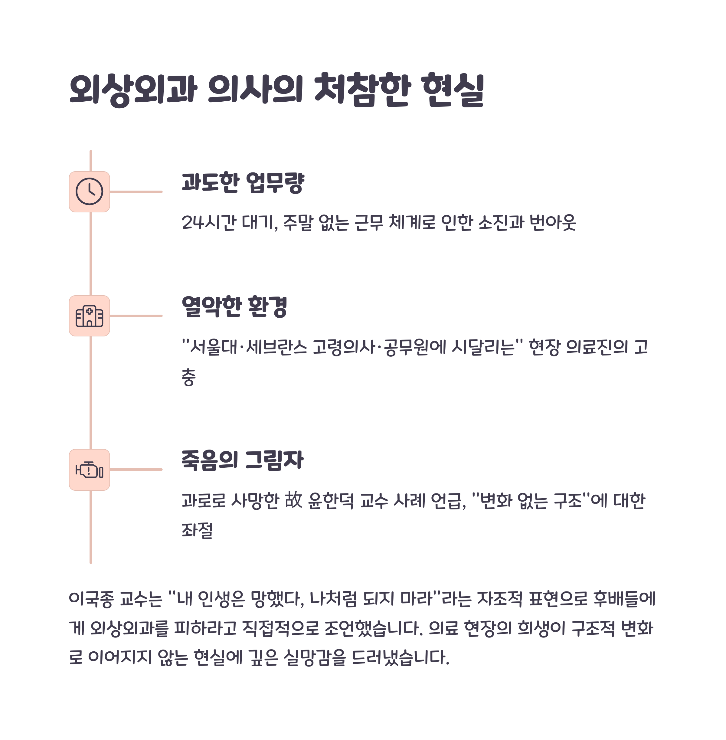 그는 서울대, 세브란스 등 대형병원 중심의 구조와 고령 중심의 의료 의사결정 문화, 공무원과의 반복되는 갈등 구조 등을 예로 들며 “바이탈과(응급·외상·중환자 분야)는 선택하지 말라”고 후배들에게 경고했습니다.