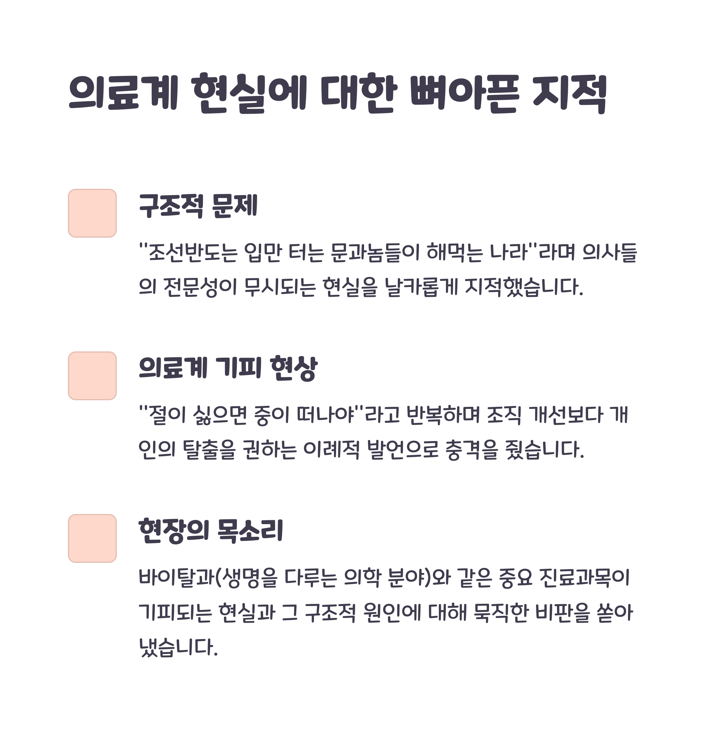 고질적인 의료 시스템과 사회구조 문제를 내부자가 외부로 알리는 계기가 될 수 있습니다. 외면하지 말아야 할 목소리로 작용하며, 구조적 논의의 촉진제가 될 수 있습니다.