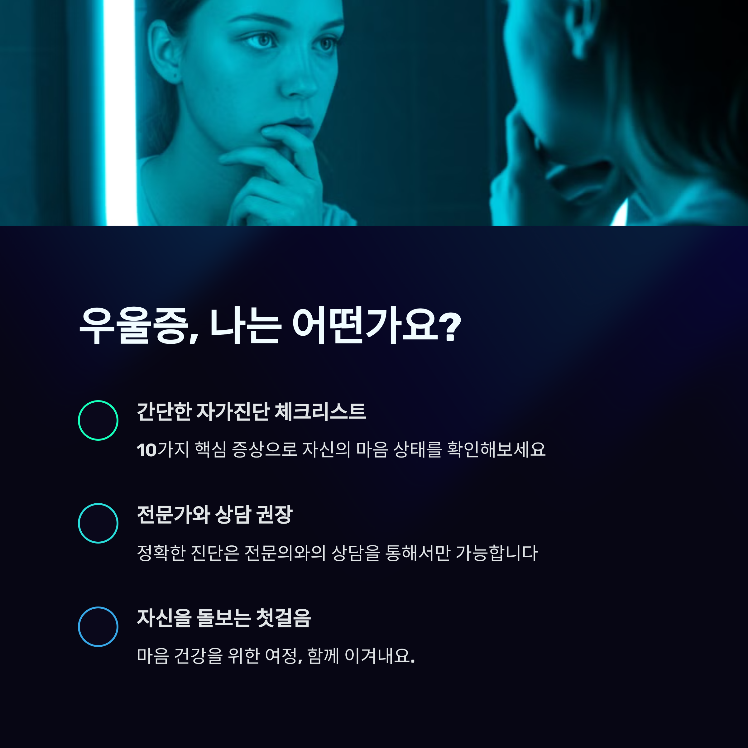 우울증은 단순한 기분 문제를 넘어 삶의 질에 큰 영향을 줄 수 있기 때문에 조기에 확인하고 관리하는 것이 중요합니다. 아래는 우울증 여부를 간단히 자가 진단해 볼 수 있는 체크리스트입니다.