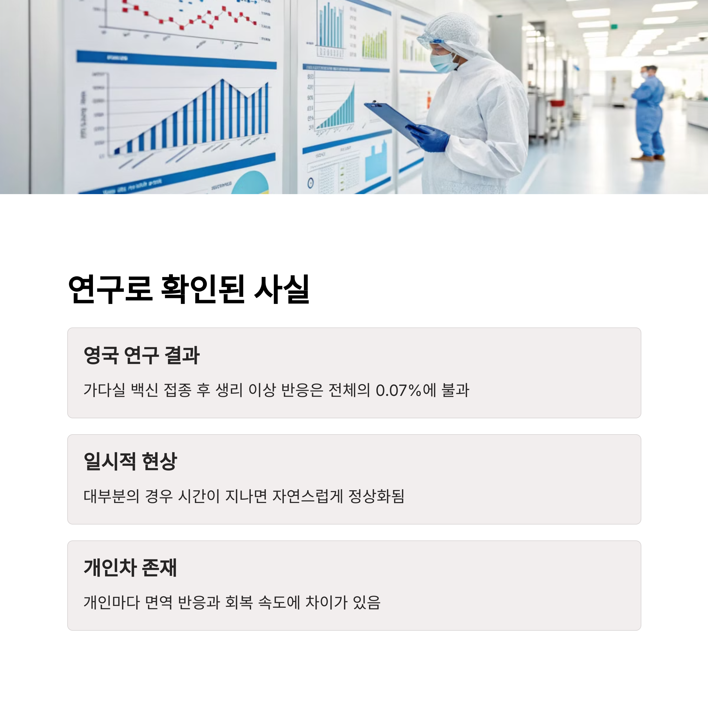 - 연구에 따르면 백신 접종 후 생리 이상 보고 비율은 약 0.07%에 불과함.