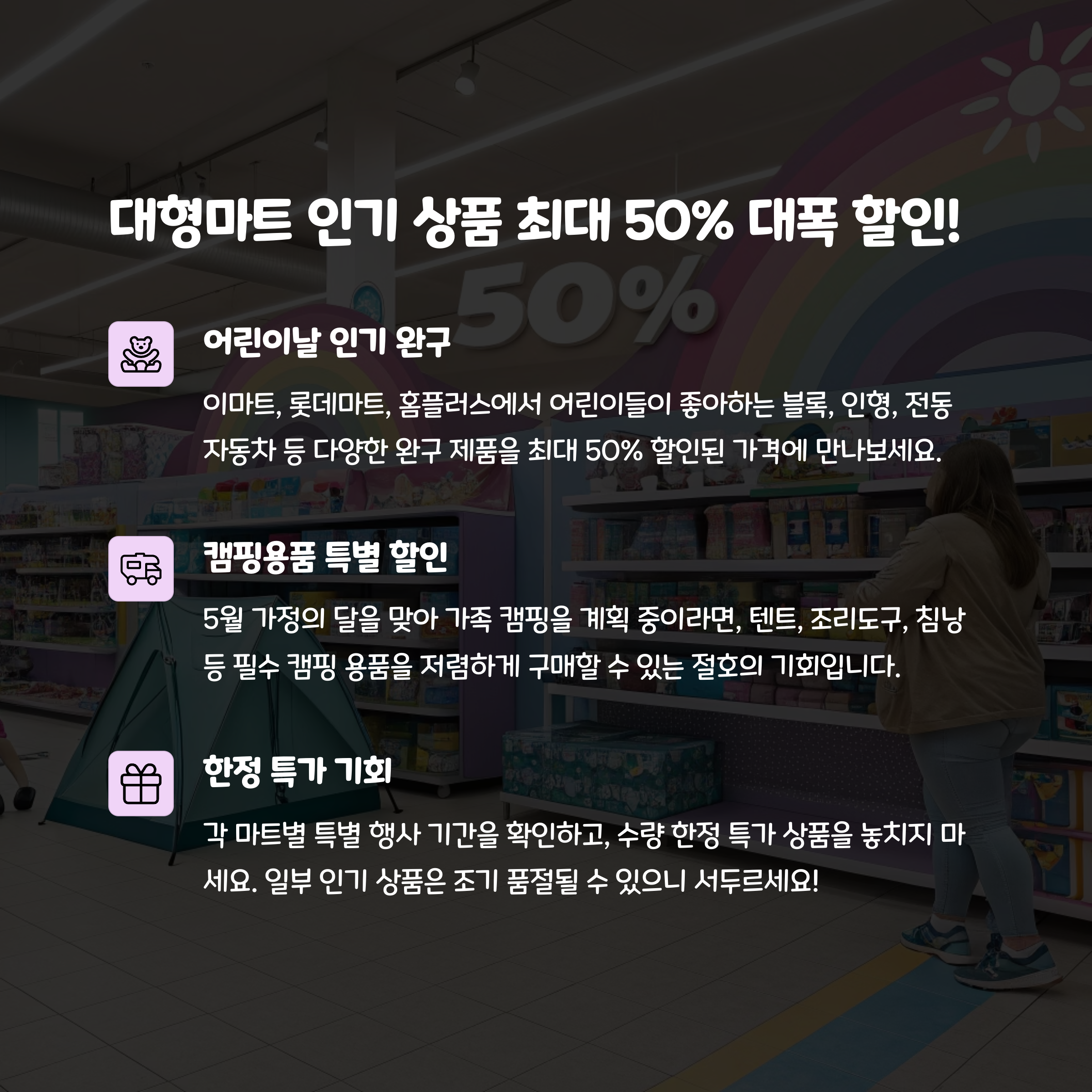 대형마트도 가정의 달을 맞아 다양한 혜택을 준비했습니다. 이마트에서는 캐릭터 완구 특별 할인을 진행하며, 행사카드로 6만원 이상 구매 시 1만원 상품권도 증정합니다. 롯데마트는 캠핑용품과 나들이 식품을 최대 50%까지 할인하고, 홈플러스는 레고와 완구 인기 브랜드 제품을 최대 40%까지 세일 중입니다. 어린이날 선물이나 가족 나들이 준비라면 지금이 찬스!