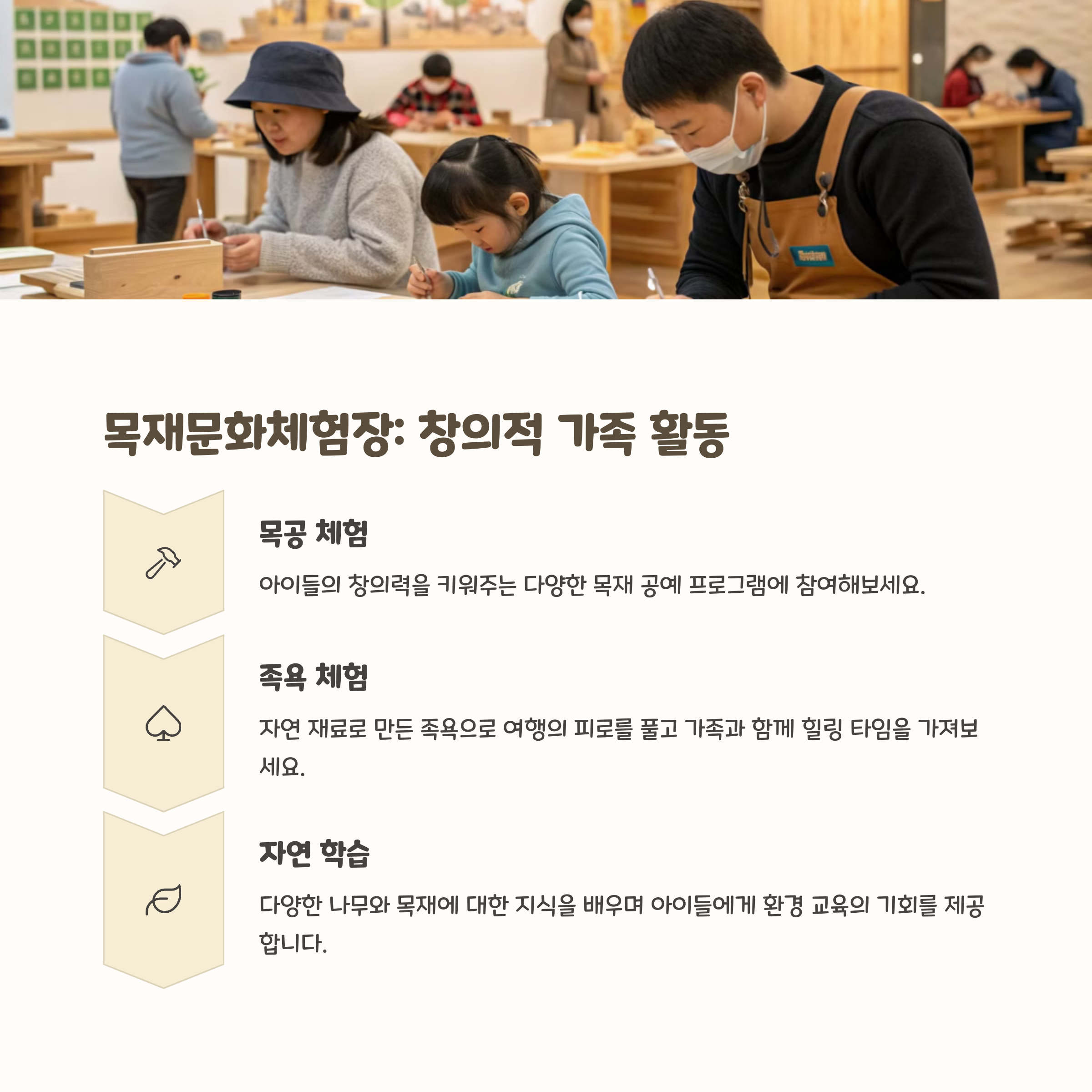 아이들과 함께 나무를 활용한 다양한 공예 체험을 즐길 수 있는 곳입니다. 목공예 수업을 통해 창의력을 키울 수 있으며, 족욕 체험 등 이색적인 프로그램도 마련되어 있습니다. 나무의 향기와 자연 친화적인 분위기가 어우러져 힐링을 느낄 수 있는 공간입니다. 가족이 함께 작품을 만들어 보는 즐거움이 큽니다.