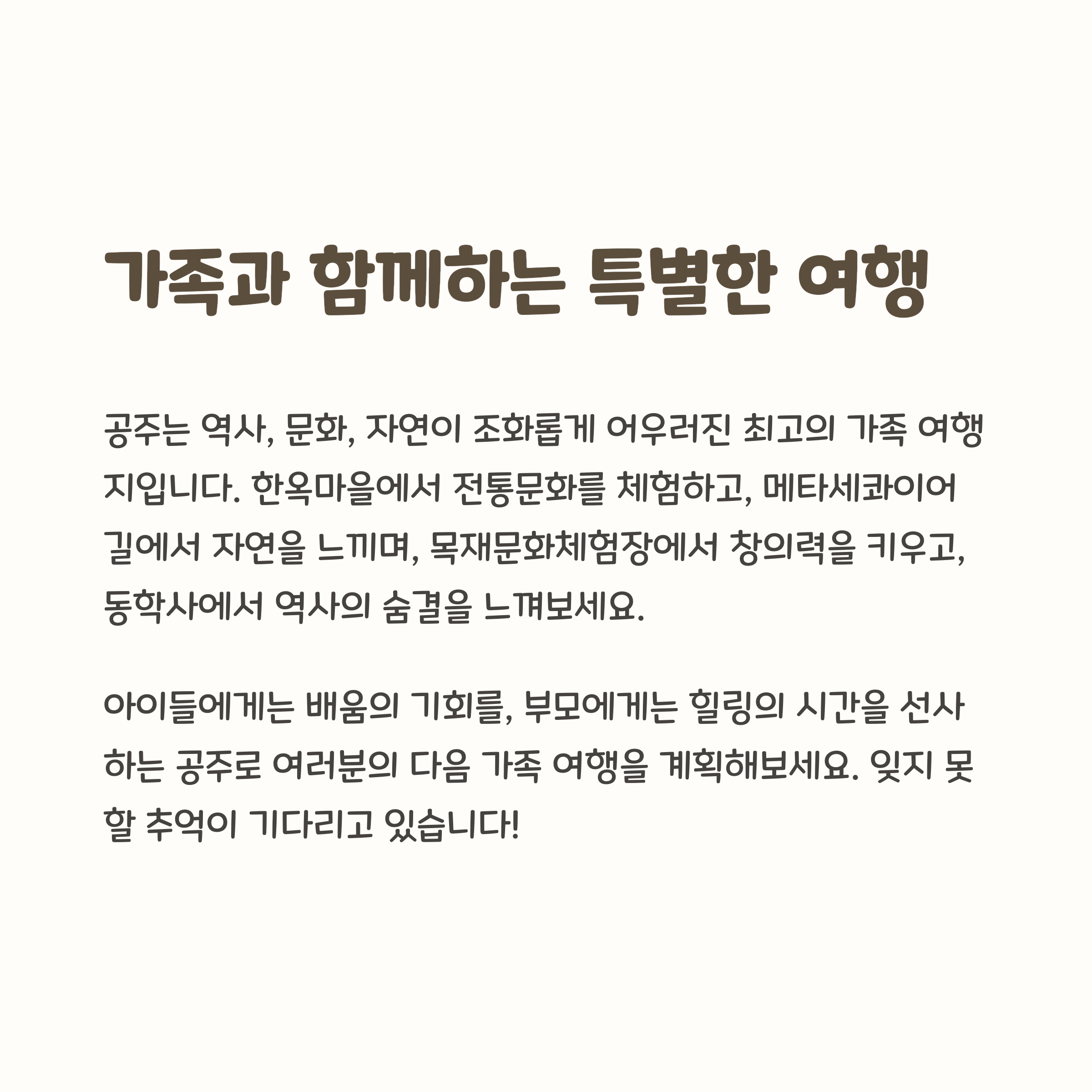 이번 주말에는 공주로 떠나보시는 건 어떨까요? 계절마다 다른 매력을 느낄 수 있는 공주에서 가족과 특별한 시간을 보내며 힐링을 만끽하세요. 좋은 추억을 만들고 돌아오길 바랍니다!