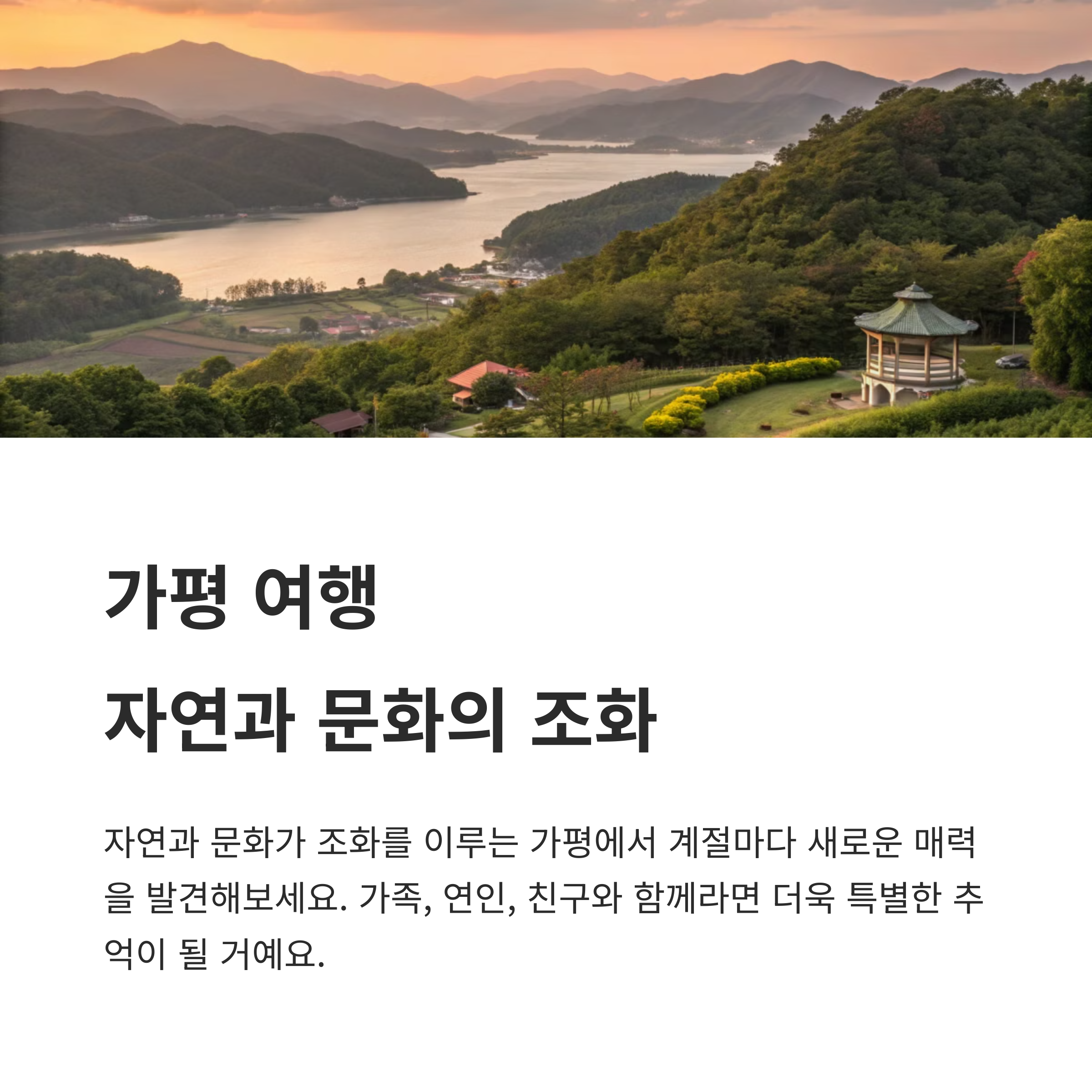 가평은 자연과 문화가 어우러진 매력적인 여행지로, 남이섬, 아침고요수목원, 쁘띠프랑스는 가평의 대표 명소입니다. 각 장소마다 독특한 분위기와 즐길 거리가 있어 연인, 가족, 친구 누구와도 즐거운 시간을 보낼 수 있습니다.