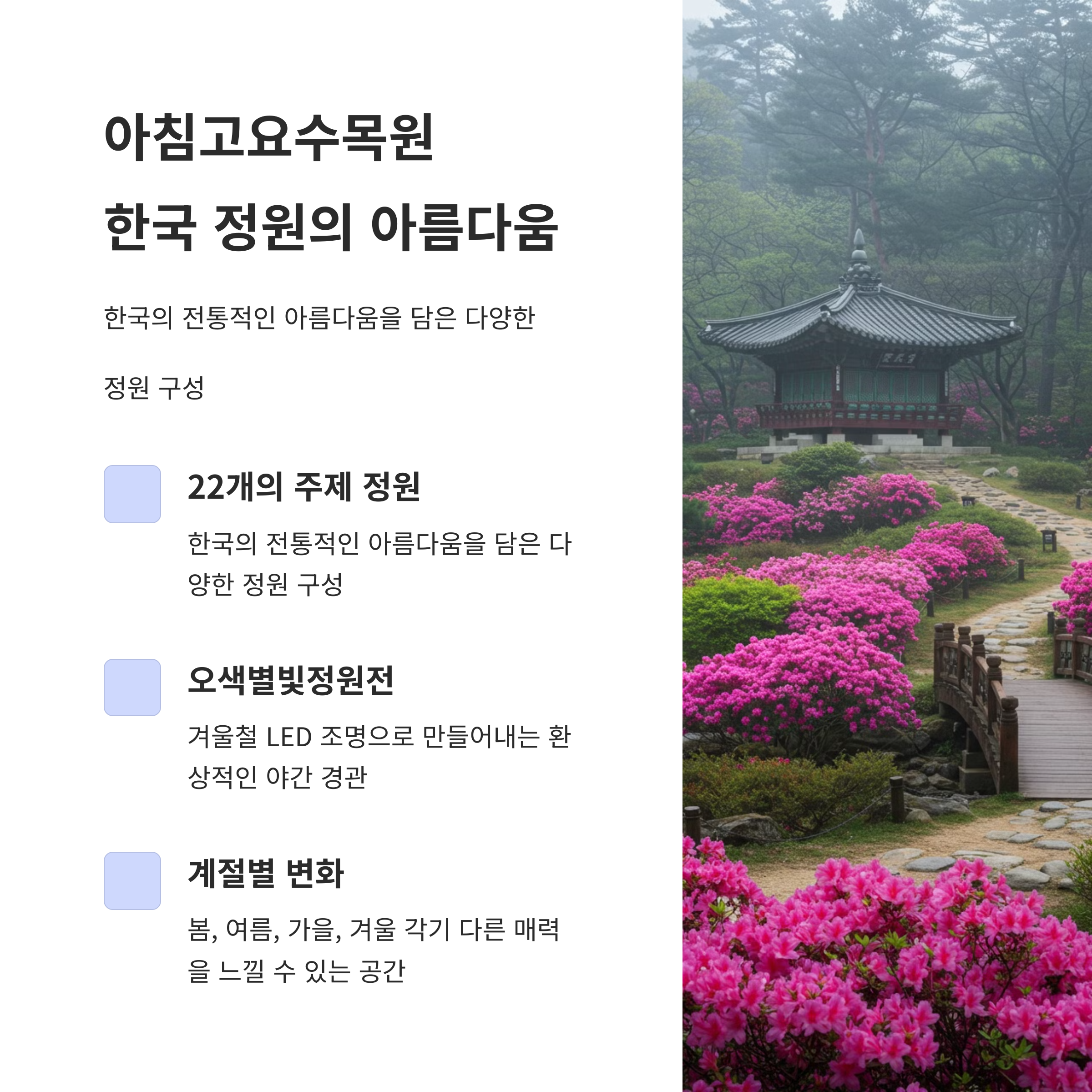 봄에는 수선화와 튤립이 만발하여 화사함을 자아내며, 여름에는 수국과 연꽃이 싱그러움을 더합니다. 가을에는 국화와 단풍이 어우러져 환상적인 분위기를 연출하며, 겨울에는 오색별빛정원전이 열려 환상적인 LED 조명으로 야경을 즐길 수 있습니다.
