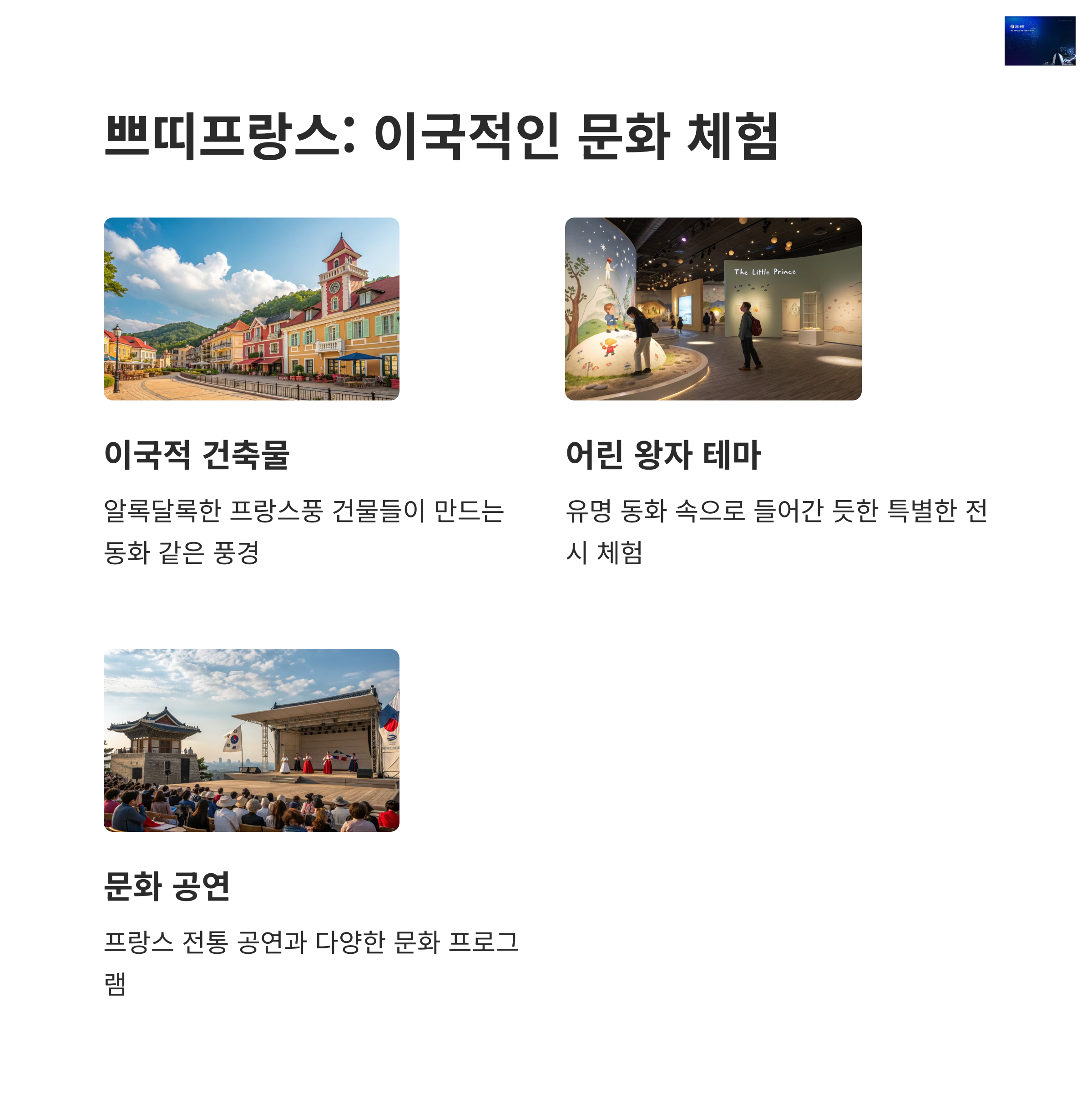 어린 왕자를 테마로 한 전시관이 인상적이며, 프랑스 전통 문화를 체험할 수 있는 다양한 프로그램이 마련되어 있어 가족과 연인이 많이 찾는 명소입니다.