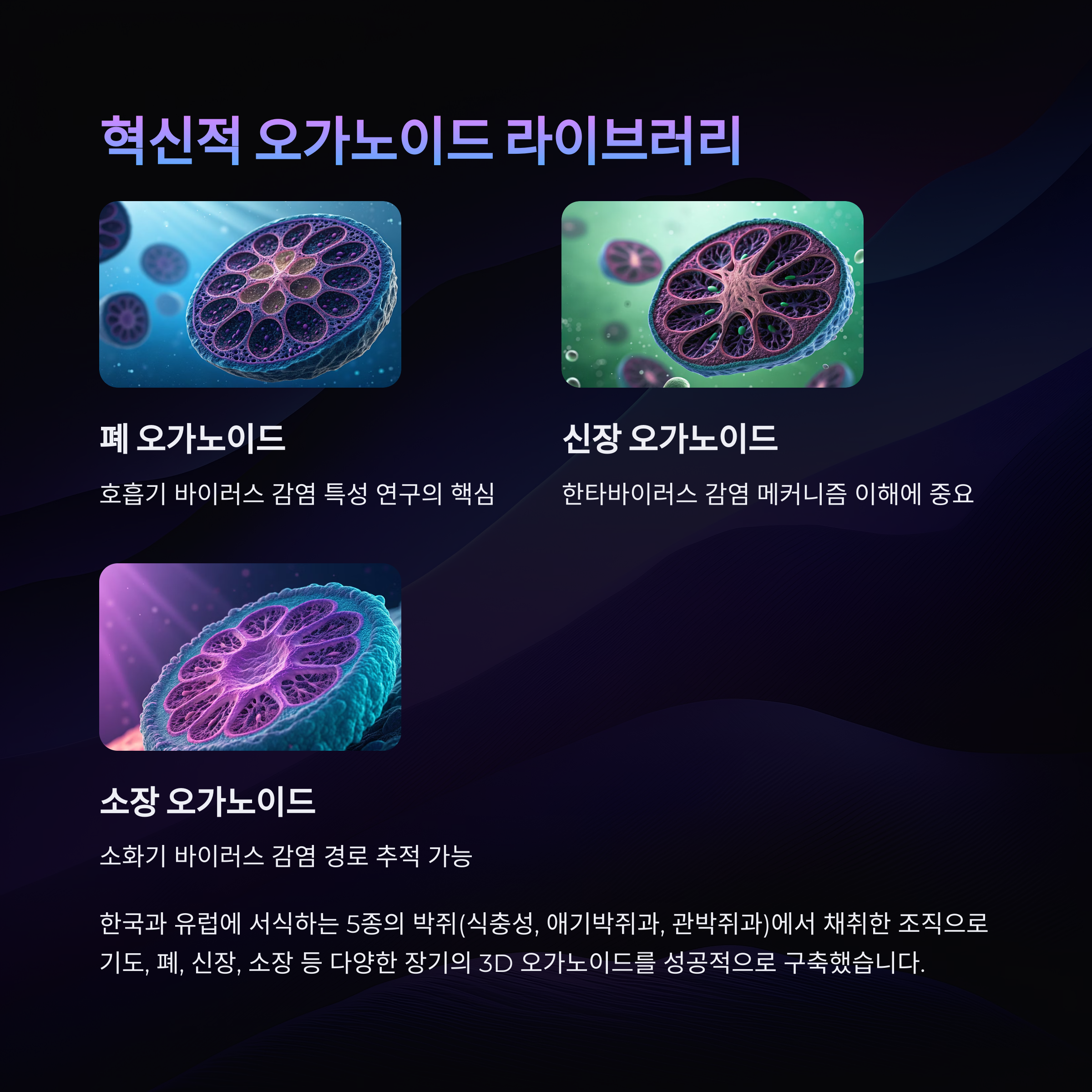 이며, 이 중 상당수가 박쥐에서 기원한 것으로 밝혀졌죠. 이번 연구는 한국 및 유럽 서식종 박쥐 5종에서 폐, 신장, 소장, 기도 등 장기 유사체(오가노이드)를 처음으로 구축하며, 감염병 연구의 새로운 기반을 마련했습니다.