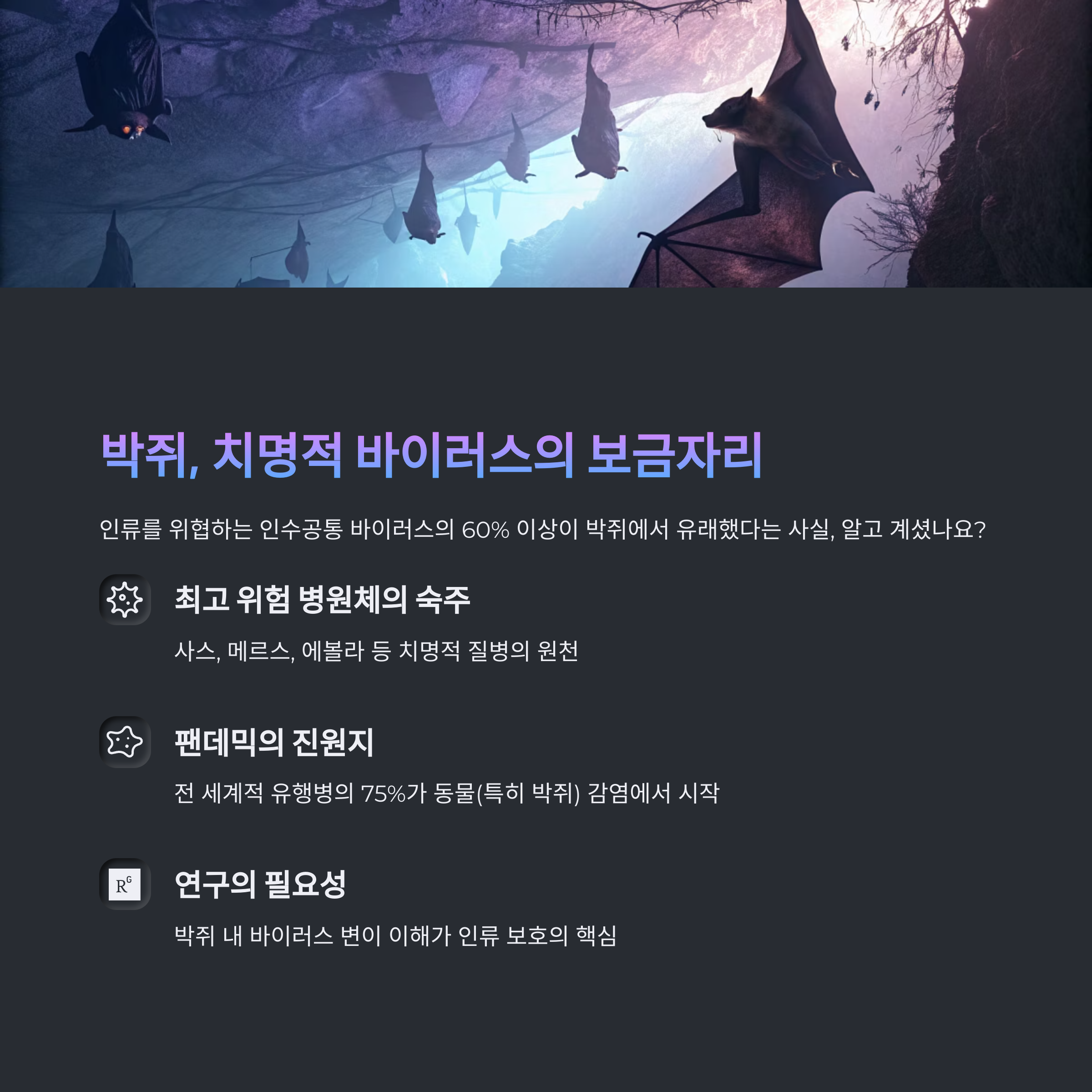 이 질문에 대한 해답을, 작지만 강력한 존재 ‘박쥐’가 쥐고 있을지 모릅니다.