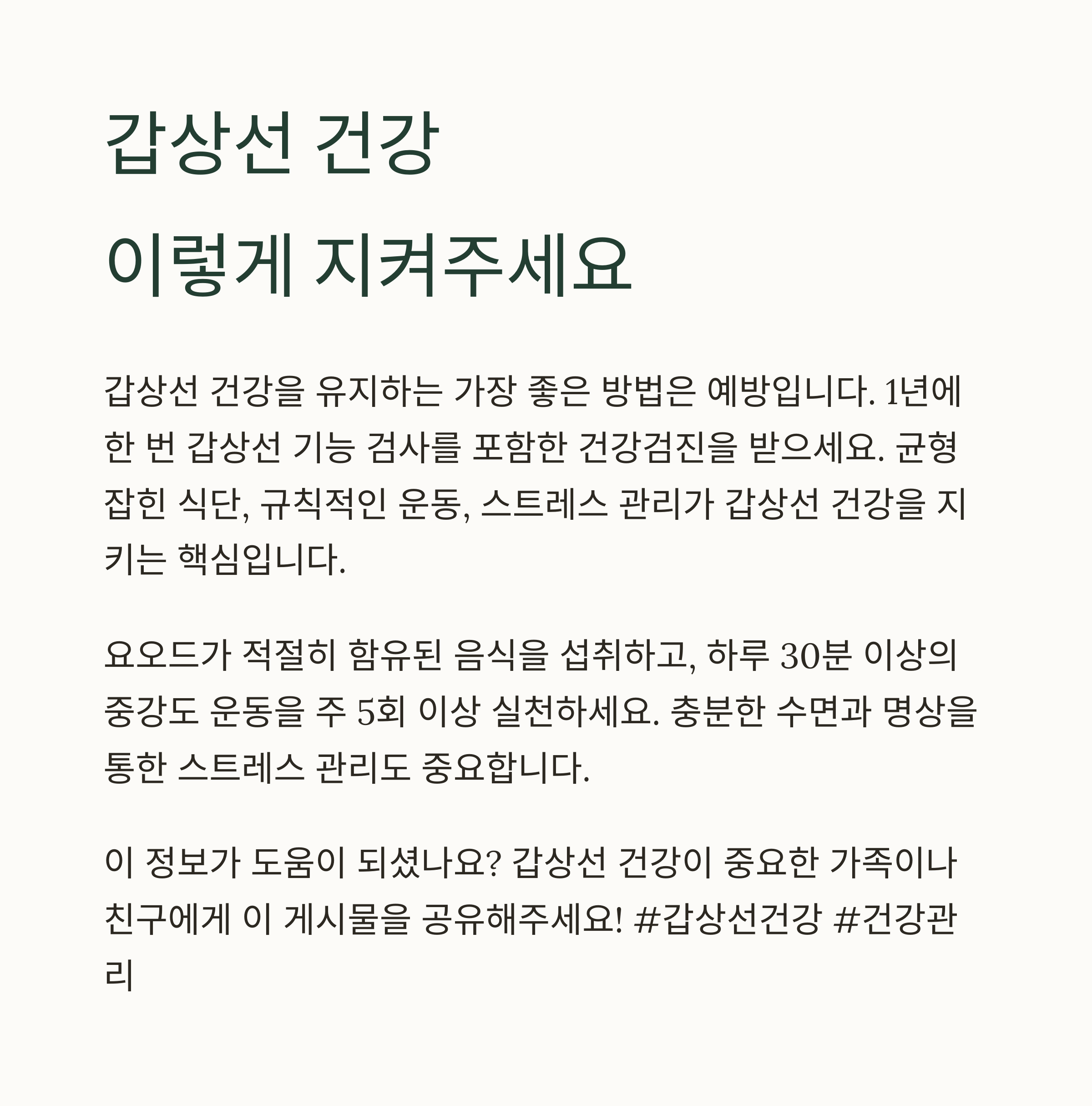 갑상선 건강은 평소에는 잘 드러나지 않지만, 이상이 생기면 우리 몸 전체의 기능에 영향을 줄 수 있는 민감한 부분입니다. 작은 변화라도 놓치지 않고 챙기는 습관이 건강한 미래를 위한 첫걸음이 될 수 있습니다. 바쁜 일상 속에서도 자신의 몸 상태에 꾸준한 관심을 기울여보세요.