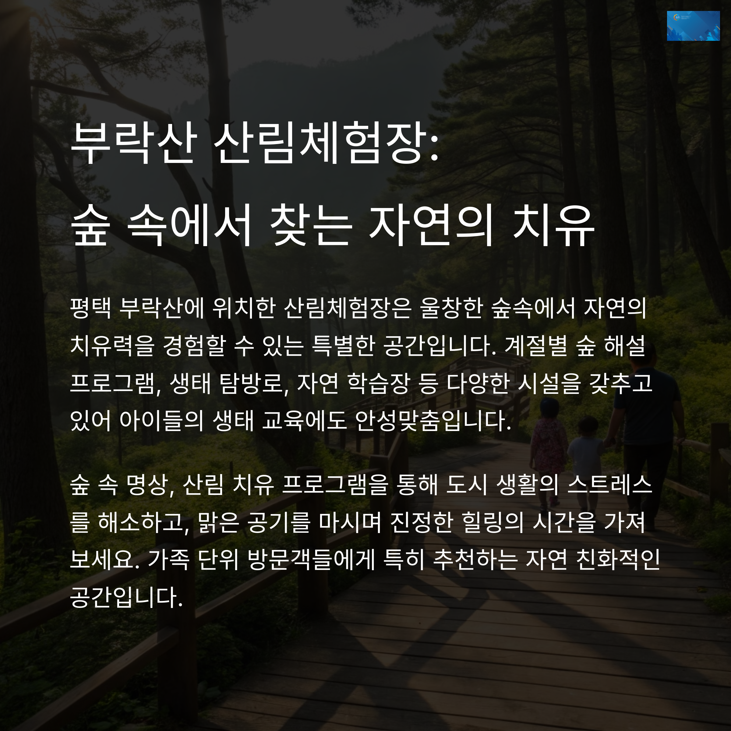 무궁화치유나라와 부락산 산림체험장이 가족 단위에 특히 좋아요. 동물 교감과 숲 체험이 가능합니다.