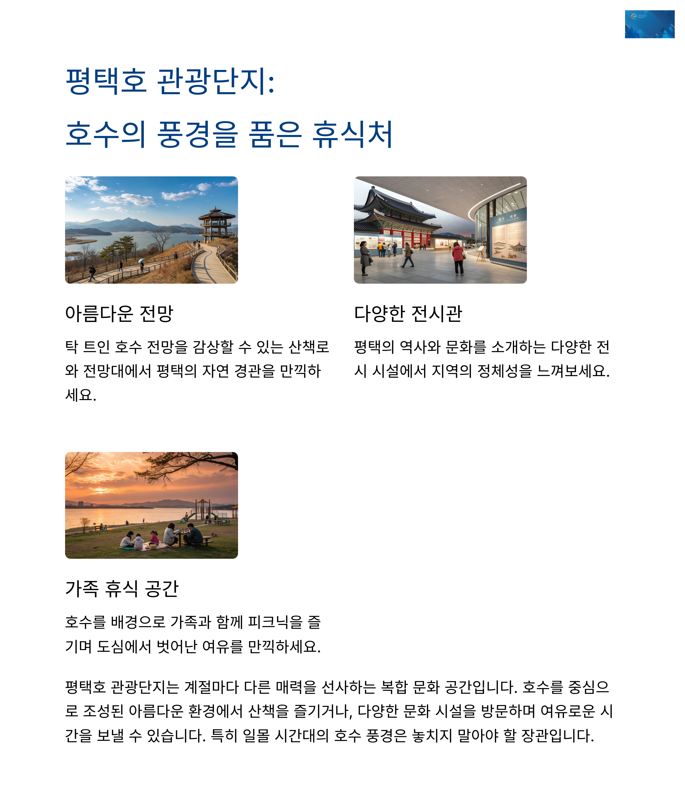 멀리 가지 않아도 충분히 힐링할 수 있다는 걸, 평택에 오면 알 수 있어요. 무궁화와 숲, 호수와 문화가 어우러진 다채로운 명소들이 여러분의 당일 여행을 더욱 특별하게 만들어 줄 거예요. 이번 주말엔 감성 가득한 평택으로, 조용한 여유와 작지만 확실한 행복을 만나보러 떠나보세요.