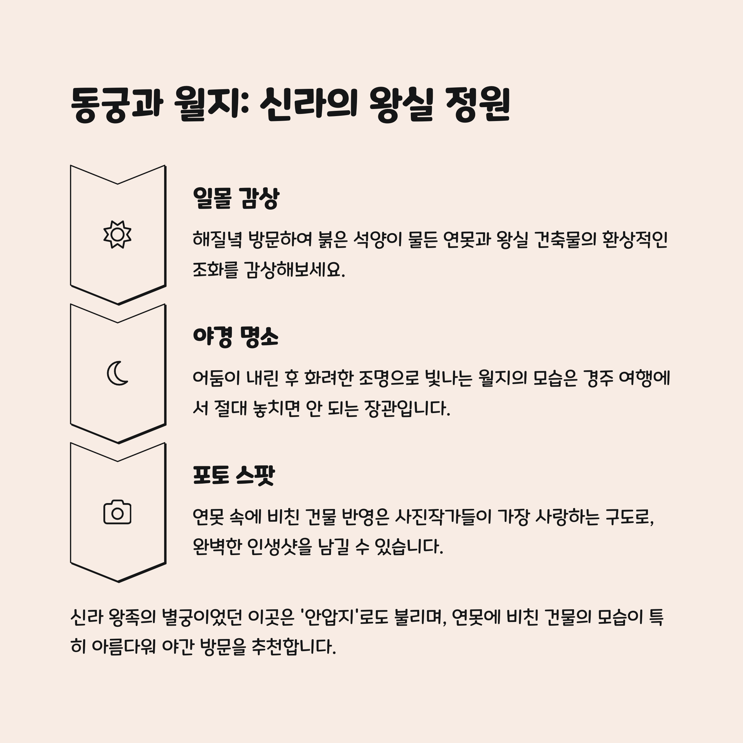 경주는 낮보다 밤이 더 매력적인 도시예요. 동궁과 월지의 야경은 은은한 조명 아래 호수에 비친 궁궐이 몽환적인 분위기를 자아냅니다. 첨성대 야경도 놓치지 마세요. 천천히 산책하며 밤의 신라를 느껴보는 시간은 정말 특별하답니다.