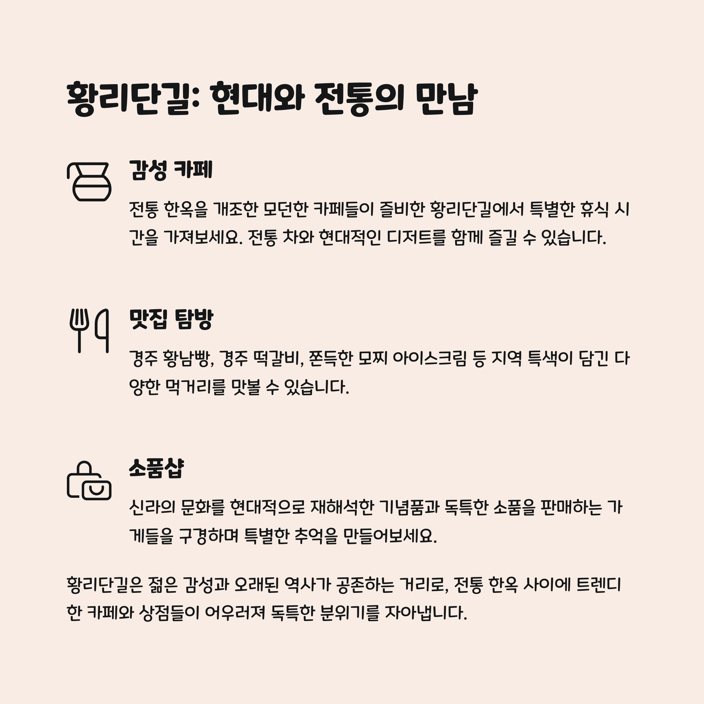 경주는 걸음걸음마다 이야기가 있고, 해가 지면 또 다른 얼굴을 보여주는 도시예요. 하루 만에도 신라 천년의 역사와 현대 감성이 어우러진 여행이 가능하다는 것, 놀랍지 않나요? 오늘 소개해드린 1박 2일 코스를 그대로 따라만 가도, 후회 없는 경주 여행이 될 거예요. 역사, 예술, 감성, 맛집까지 완벽하게 갖춘 경주!