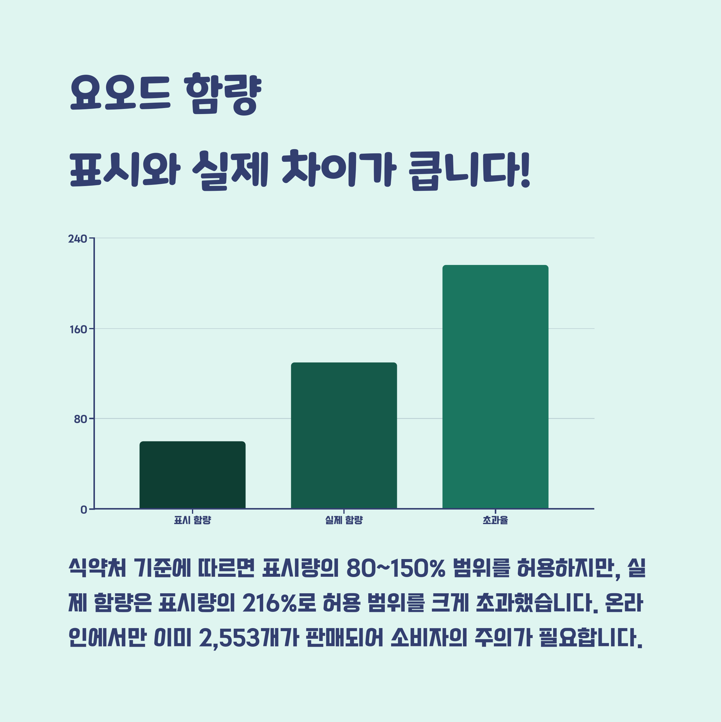 식약처 기준에 따르면, 건강기능식품에 표시된 영양소 함량은 실제 함량의 ±20% 내외여야 합니다. 이번 제품의 경우 표시량 60μg 대비 실측치가 129.7μg로, 2배 이상 차이가 나는 결과였죠. 이는 표시 기준을 명확히 따르지 않았거나 제조 시 균일 혼합이 되지 않았을 가능성이 있으며, 같은 브랜드 제품이라도 표시된 요오드 수치가 60μg, 120μg 등 다양하게 유통된 점도 혼란을 키운 원인입니다.
