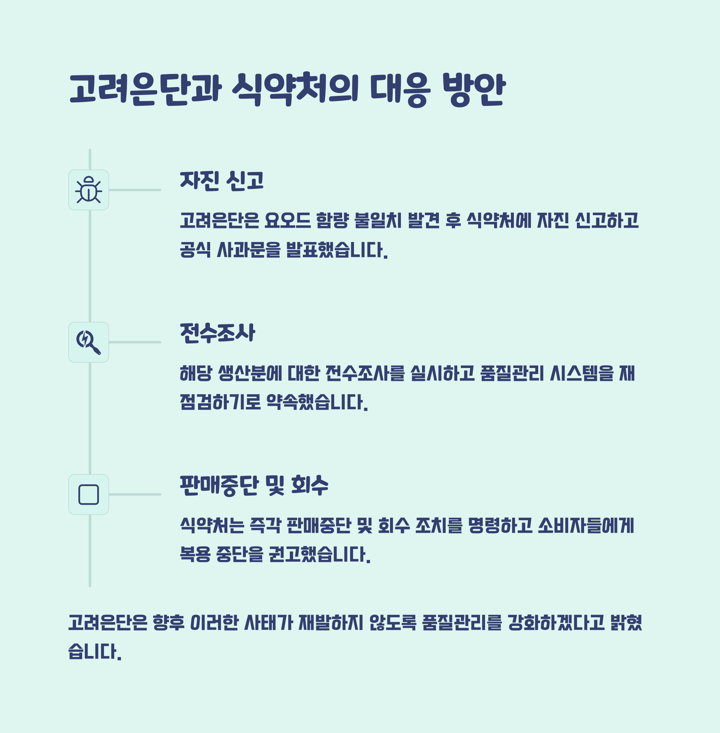최근 고려은단의 건강기능식품 ‘멀티비타민 올인원’ 제품에서 요오드 함량 표시 오류가 발생해 식약처가 회수 조치를 내렸습니다. 제품에는 요오드가 60μg으로 표시되어 있었지만, 자가 검사 결과 실제 함량은 129.7μg이 검출돼 표시 기준(허용 범위 48~90μg)을 초과한 것으로 확인됐습니다. 단순한 수치 오류가 아니라 소비자의 섭취 안전성과 신뢰에 직결된 문제이기 때문에 더욱 주의가 필요합니다.