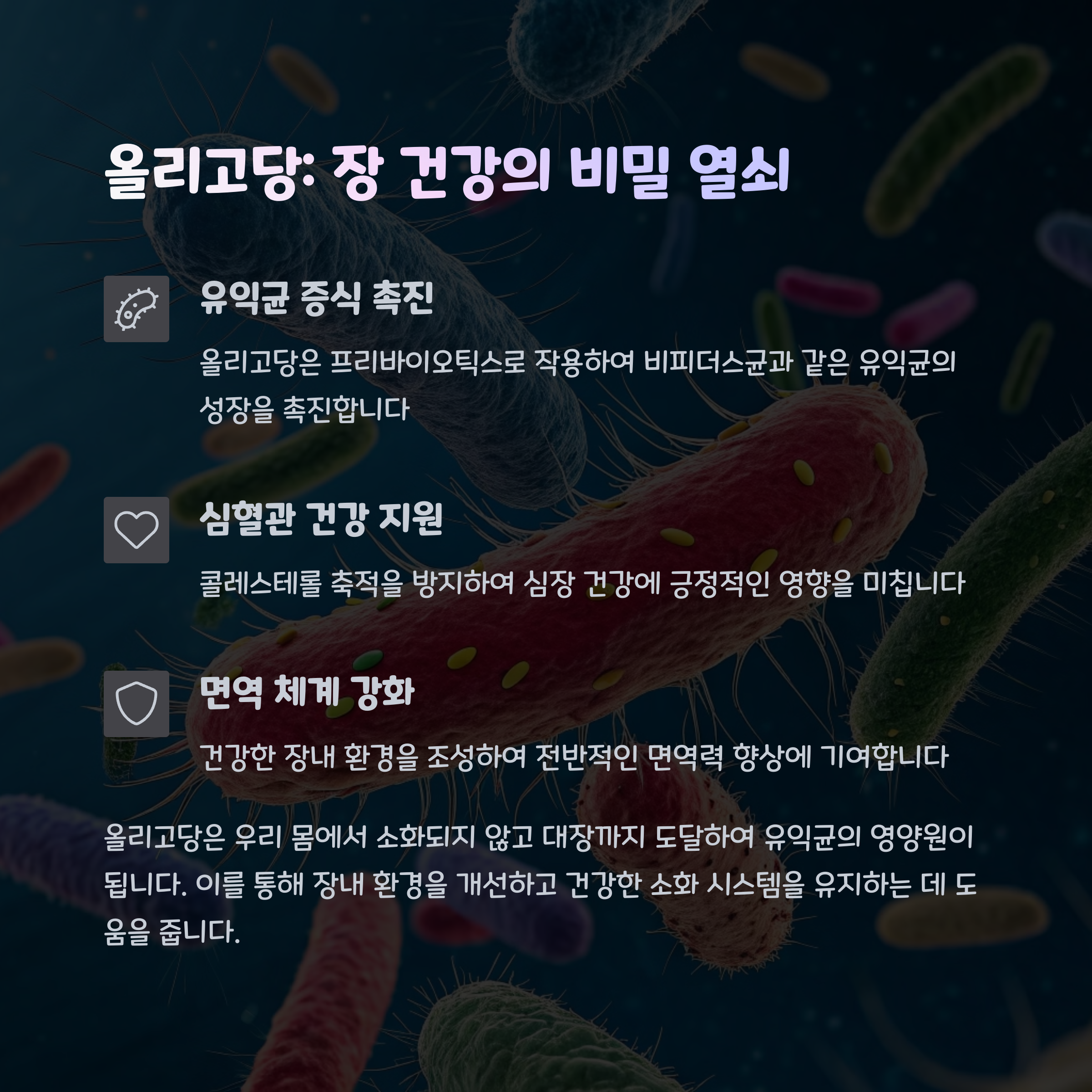 올리고당은 장내 유익균 증식을 돕고, 프리바이오틱스 역할을 하여 장 건강을 개선하는 데 기여합니다. 특히 올리고당은 콜레스테롤 축적을 억제하여 혈관 건강을 유지하고, 심혈관 질환 예방에 도움을 줄 수 있습니다. 규칙적으로 섭취하면 장내 미생물 균형이 개선되어 혈압 관리에도 긍정적인 영향을 미칩니다. 다만, 과도한 섭취는 복부 팽만을 유발할 수 있으므로 적정량을 지키는 것이 중요합니다.