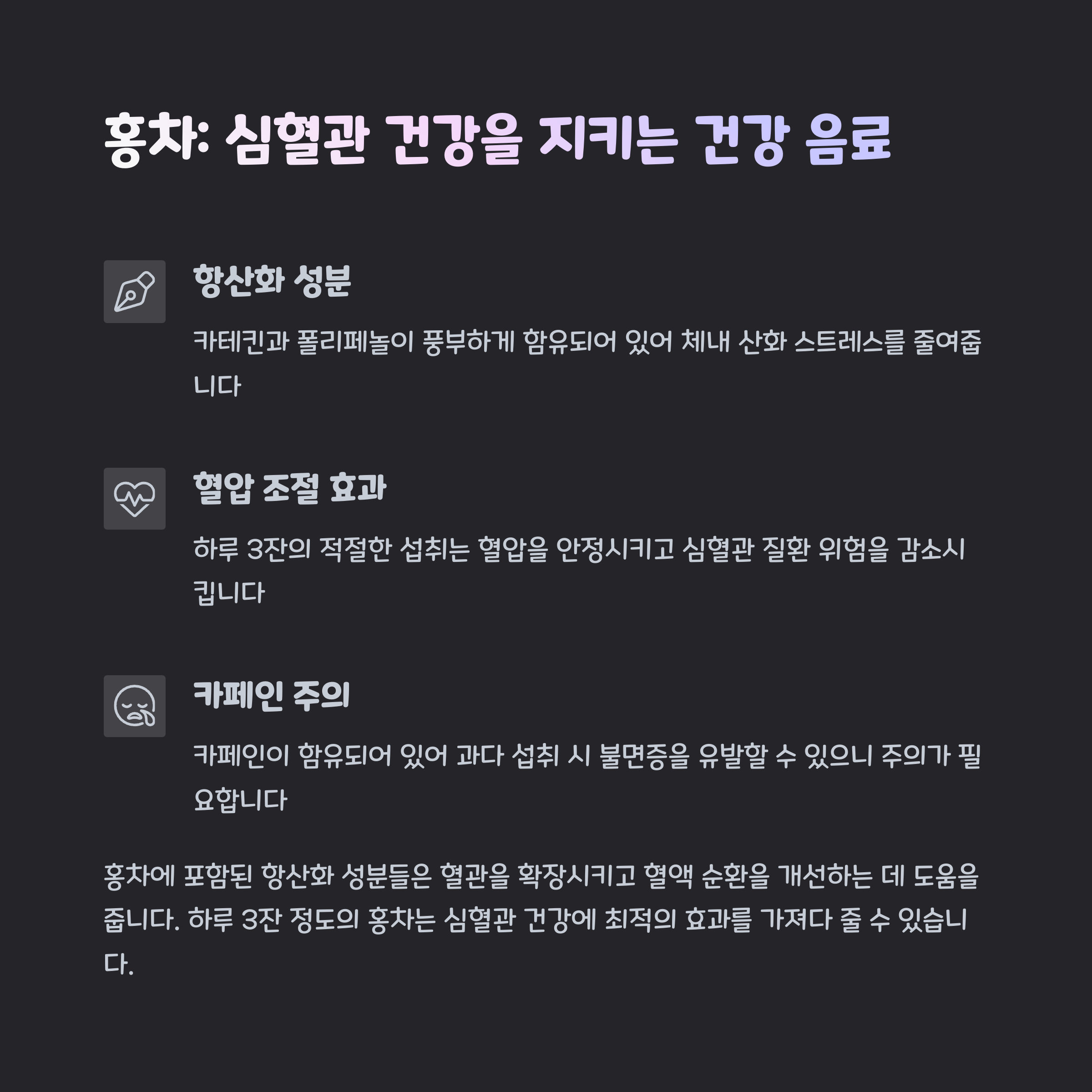 홍차는 카테킨과 폴리페놀 성분이 풍부하여 강력한 항산화 작용을 합니다. 이러한 성분들은 혈관을 확장하고, 혈액 순환을 개선하여 혈압을 낮추는 데 도움이 됩니다. 또한, 홍차의 플라보노이드는 염증을 감소시키고 심혈관 질환 위험을 줄이는 역할을 합니다. 하루에 3잔 정도가 적당하며, 과도한 섭취 시 카페인으로 인해 불면증이나 심장 두근거림이 발생할 수 있으므로 주의가 필요합니다.