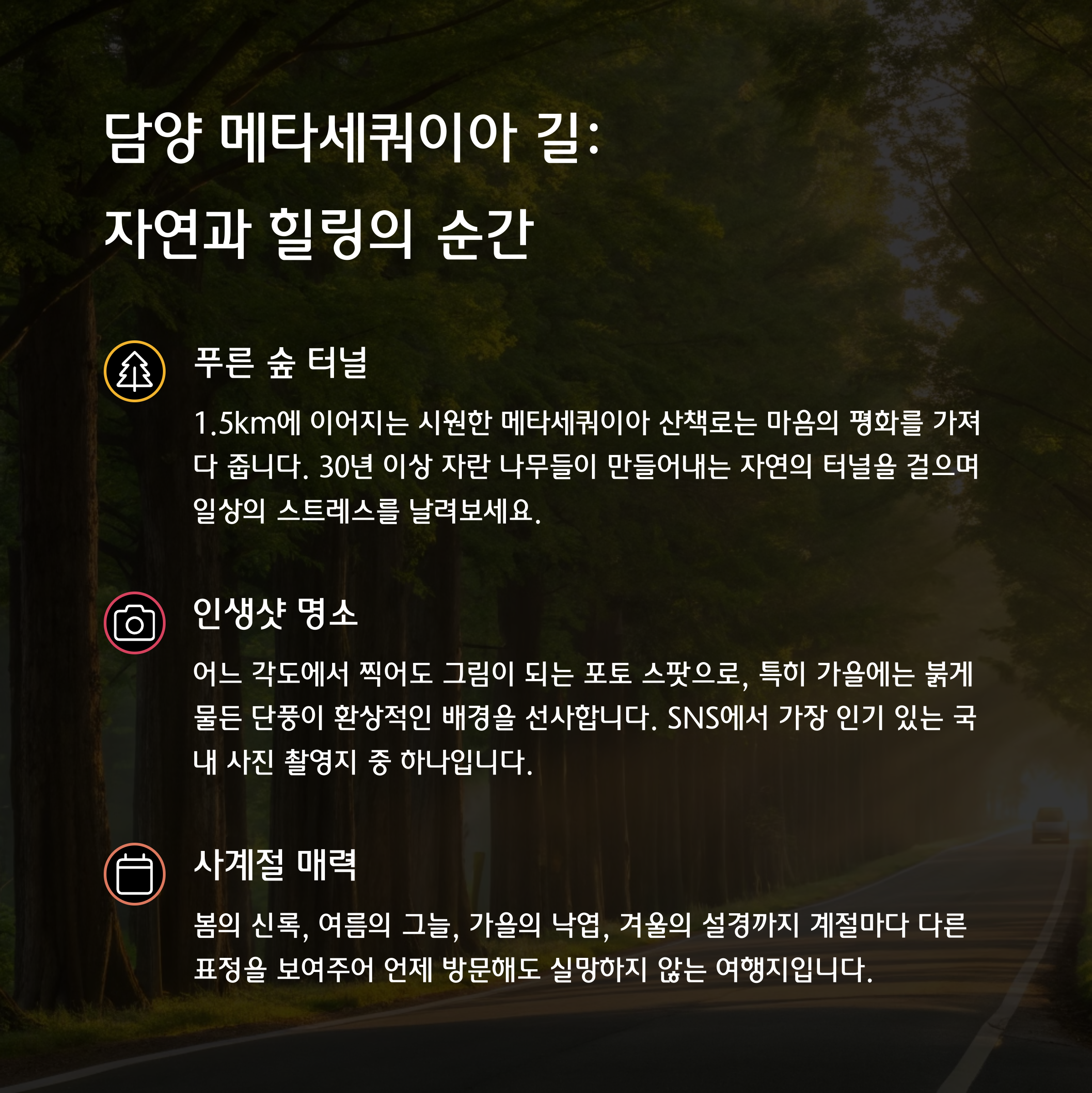 담양은 걷기 좋은 도시예요. 그중에서도 메타세쿼이아 길은 사계절 내내 다른 분위기를 보여주는 ‘시간이 느리게 흐르는’ 산책로입니다. 정돈된 나무들 사이로 햇살이 스며들고, 바람 따라 흔들리는 나뭇잎 소리가 마음까지 편안하게 만들어줘요. 가족 여행은 물론, 커플 데이트, 혼자 떠나는 힐링 여행까지 모두에게 어울리는 공간입니다.