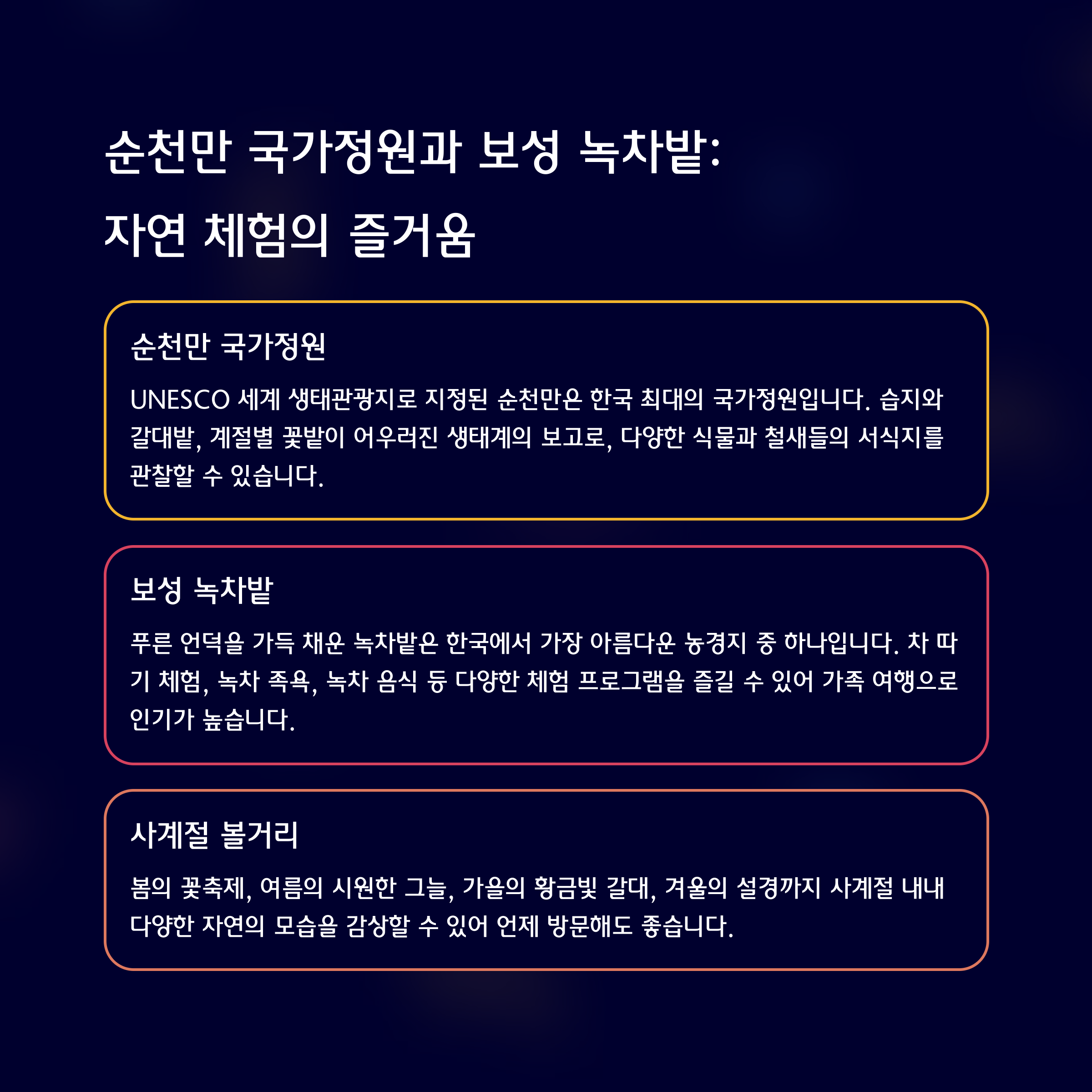 | 순천·보성 | 자연, 체험, 가족여행 | 패밀리&체험여행 |