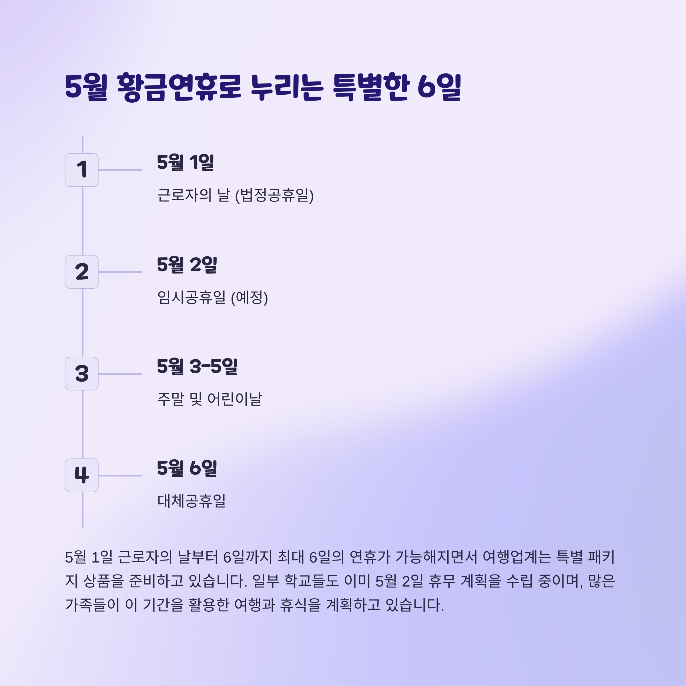 특히 5월 2일이 임시공휴일로 지정될 경우, 6일간의 연속 휴일이 가능하죠.
