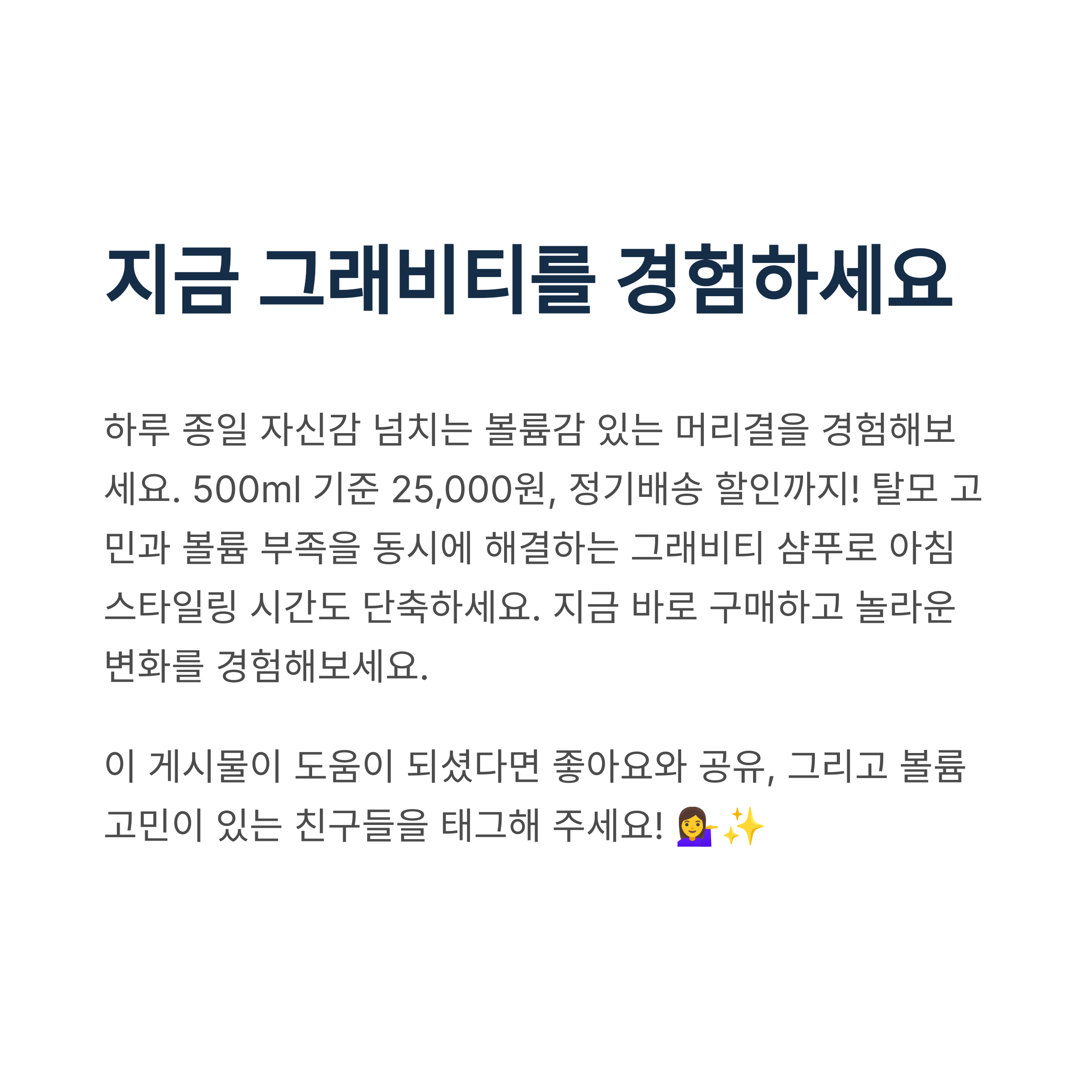 샴푸 하나 바꿨을 뿐인데 두피 컨디션이 이렇게 달라질 수 있을까 싶을 만큼, 그래비티 샴푸는 실제 사용자들 사이에서 만족도가 꽤 높은 제품입니다. 성분 하나하나가 기능을 담고 있고, 자극 없이 매일 사용할 수 있다는 점도 큰 장점이죠. 지성 두피로 매일 답답함을 느끼셨던 분들이라면, 이번 기회에 한 번쯤 체험해볼 만합니다. 하루를 시작하는 ‘두피 루틴’을 조금 더 산뜻하고 건강하게 만들고 싶다면, 지금이 바로 그 첫걸음일지도 몰라요.
