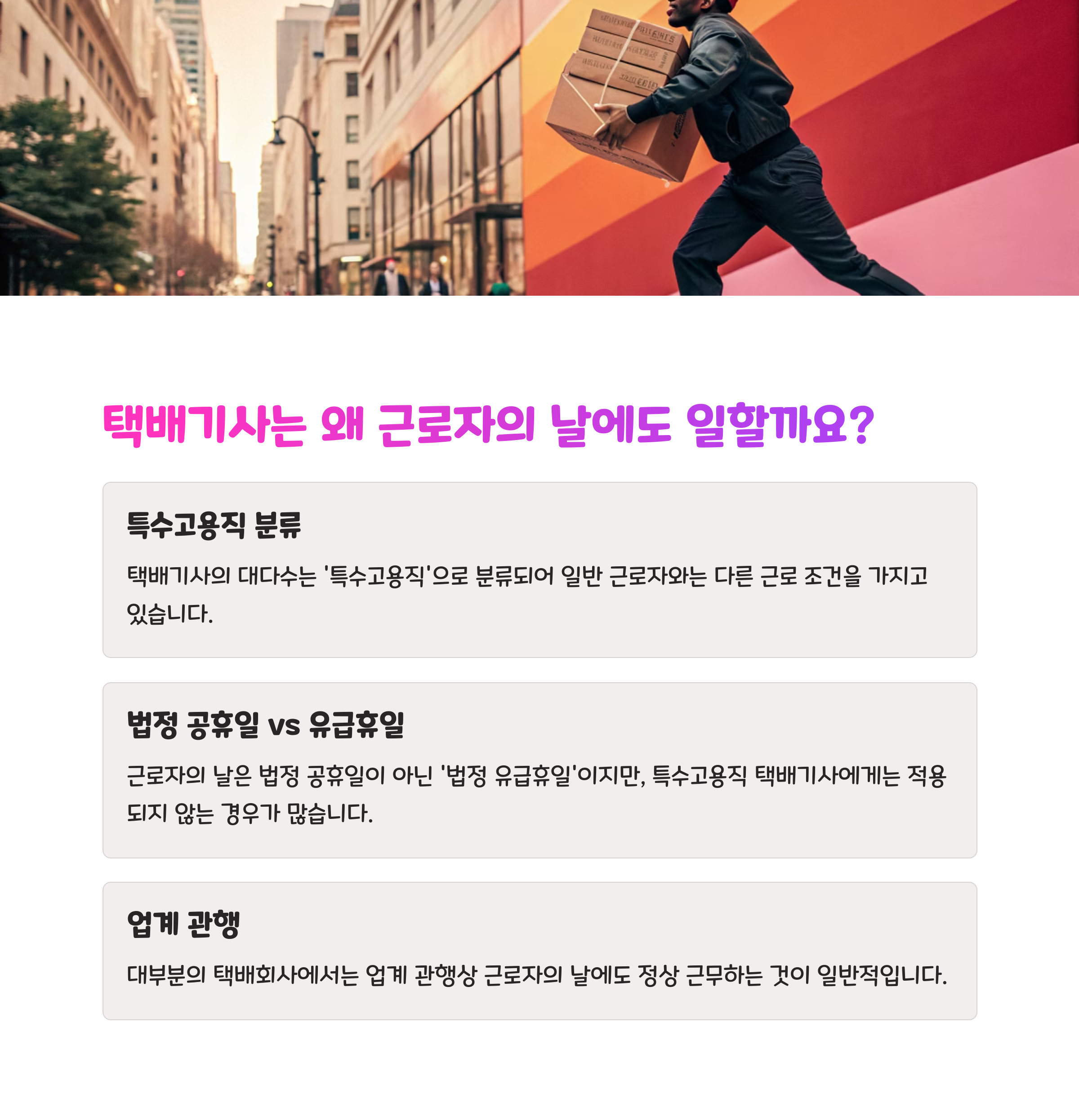 CJ대한통운, 롯데택배, 한진택배 등 일반 민간 택배사들은 5월 1일 근로자의 날에도 대부분 배송을 진행합니다. 이는 택배 기사님들이 일반 근로자가 아닌 ‘특수고용직’으로 분류되기 때문입니다. 법적으로는 유급휴일 적용 대상이 아니기 때문에, 각 택배사나 대리점별로 사전 공지를 따르지만 실질적으로는 ‘정상 운영’하는 곳이 많습니다. 다만 일부 지역에서는 기사 개인 사정이나 대리점 상황에 따라 달라질 수 있으니 배송사 공지를 꼭 확인해주세요.