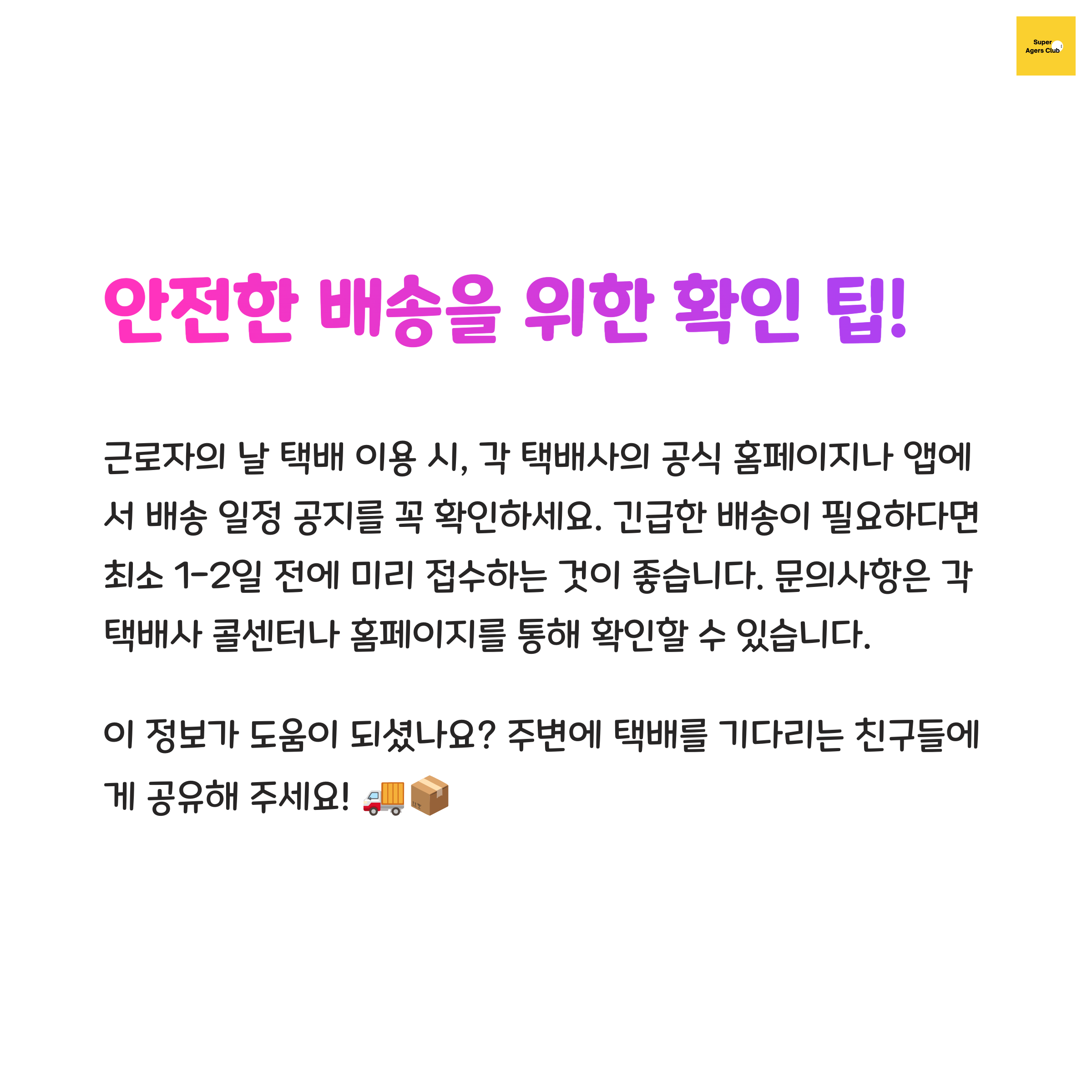안녕하세요. 요즘은 택배 하나쯤 매일 기다리게 되죠? 그런데 5월 1일 ‘근로자의 날’이 다가오면서 많은 분들이 궁금해 하시는 게 바로 “택배 오나요?”라는 질문입니다. 택배가 올지 안 올지는 일반택배냐 우체국택배냐에 따라 달라질 수 있습니다. 실제로 배송 가능성부터 근로자의 날 근무 수당까지, 헷갈리는 내용을 이 글 하나로 깔끔하게 정리해드릴게요. 특히 연휴 전후로 택배 수령 계획 있으신 분들은 꼭 확인해주세요!
