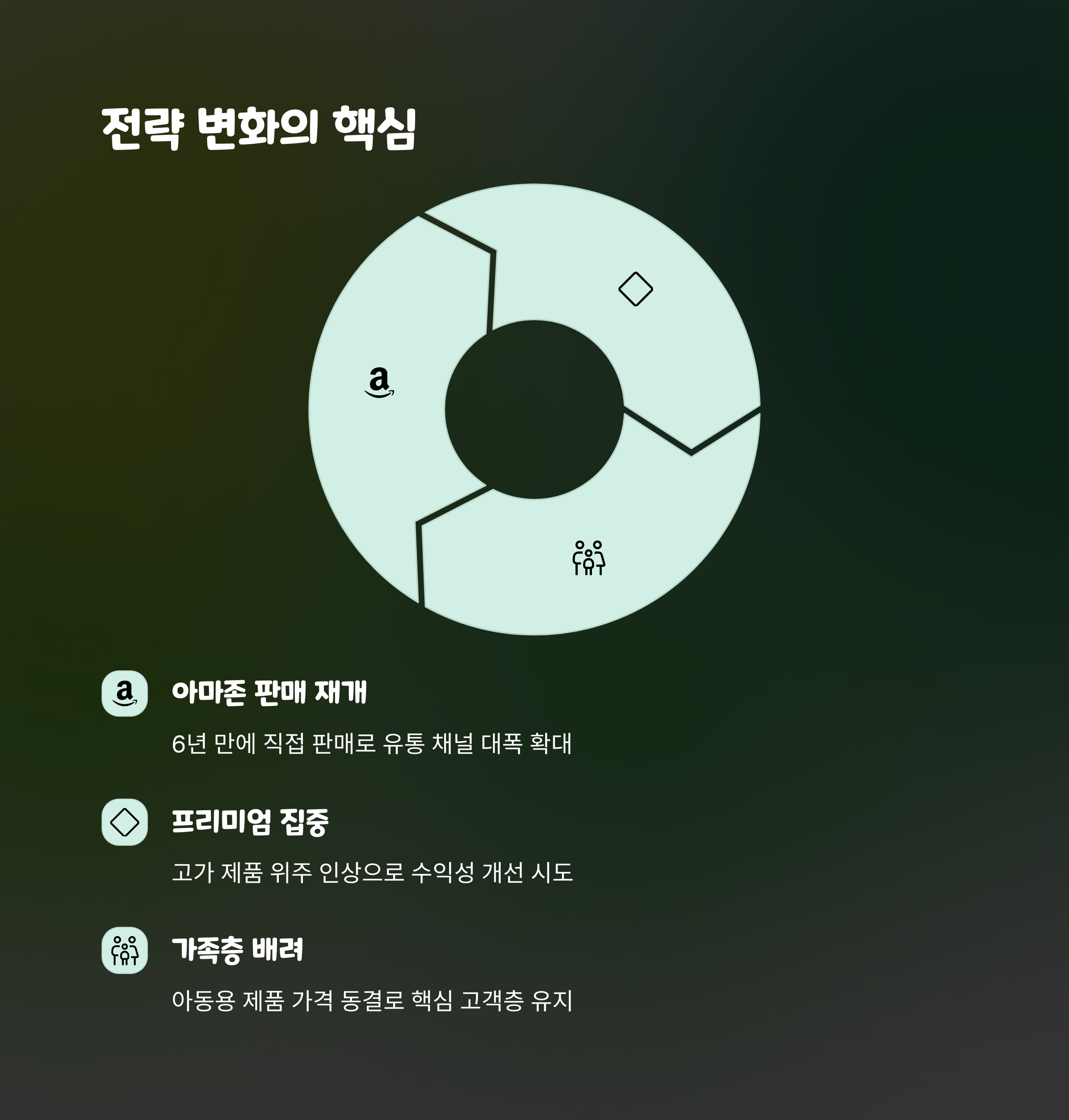 나이키는 2019년 이후 중단했던 아마존 직접 판매를 2025년 6월부터 재개합니다. 이는 온라인 채널 강화 전략의 일환으로, 소비자 접근성을 높이려는 시도입니다. “고객이 원하는 플랫폼에서 나이키를 만나게 하겠다”는 공식 입장을 통해, 브랜드 중심 전략을 온라인 중심으로 다시 세팅하고 있음을 알 수 있습니다.
