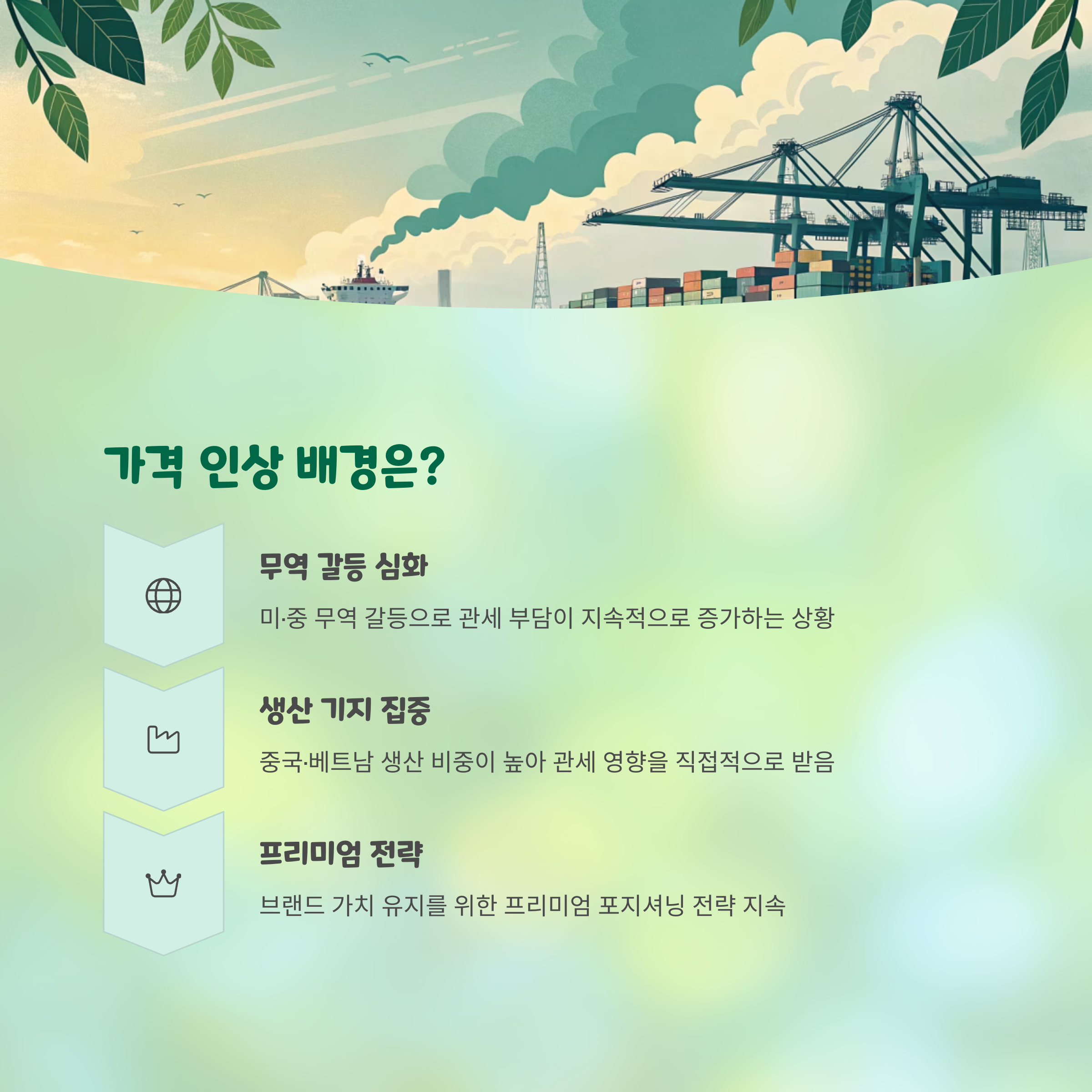 브랜드 가치 유지와 관세 부담 전가, 프리미엄 전략 고수라는 복합적 이유로 실적 부진에도 가격을 인상하고 있습니다.