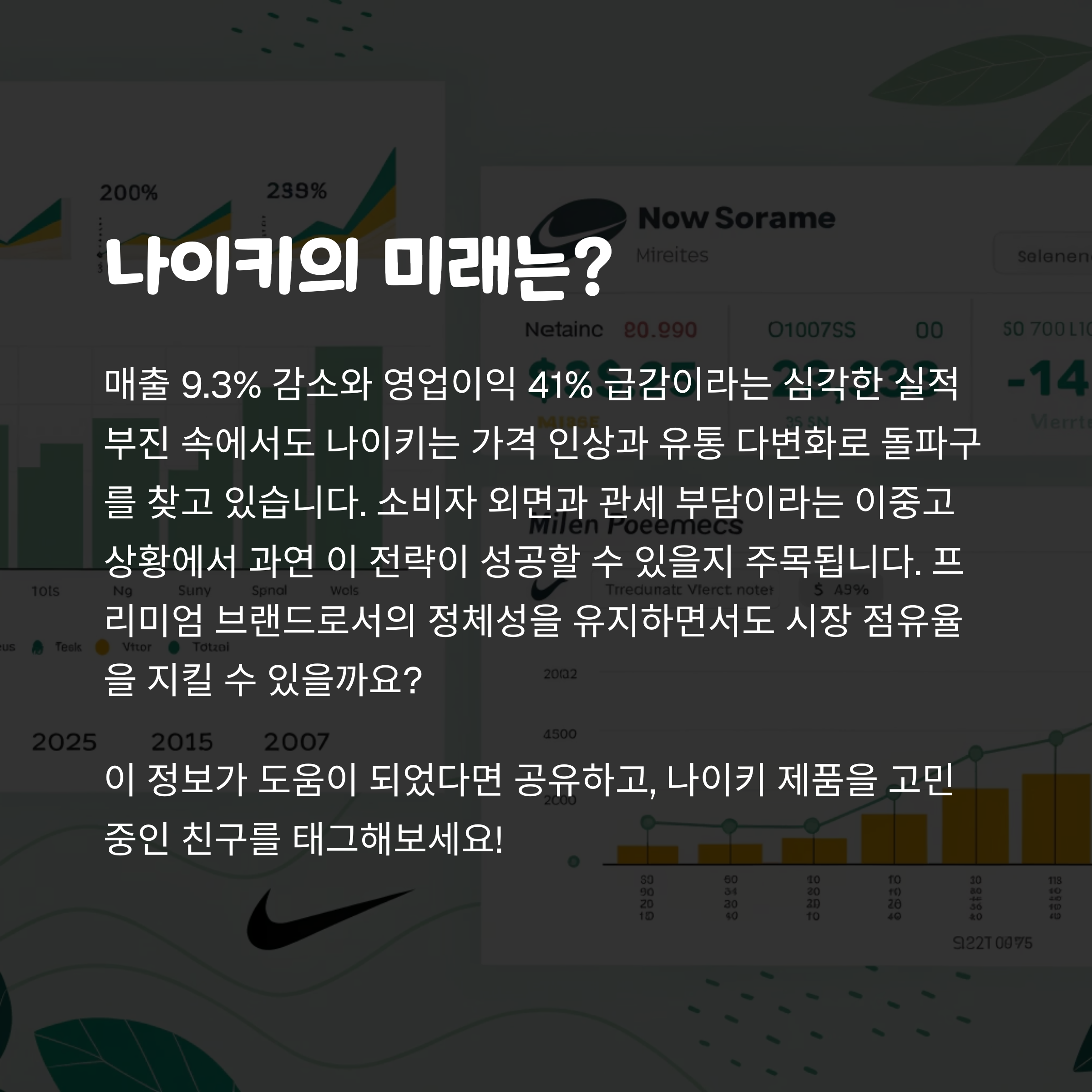 나이키는 위기 속에서도 프리미엄 가격 전략을 유지하며 브랜드 이미지를 지키는 데 집중하고 있습니다. 하지만 소비자의 눈높이는 변하고 있습니다. 고가 전략이 계속 유효할지, 아니면 전략 조정이 불가피할지—2025년 나이키의 실적과 시장 반응이 그 해답을 줄 것입니다.