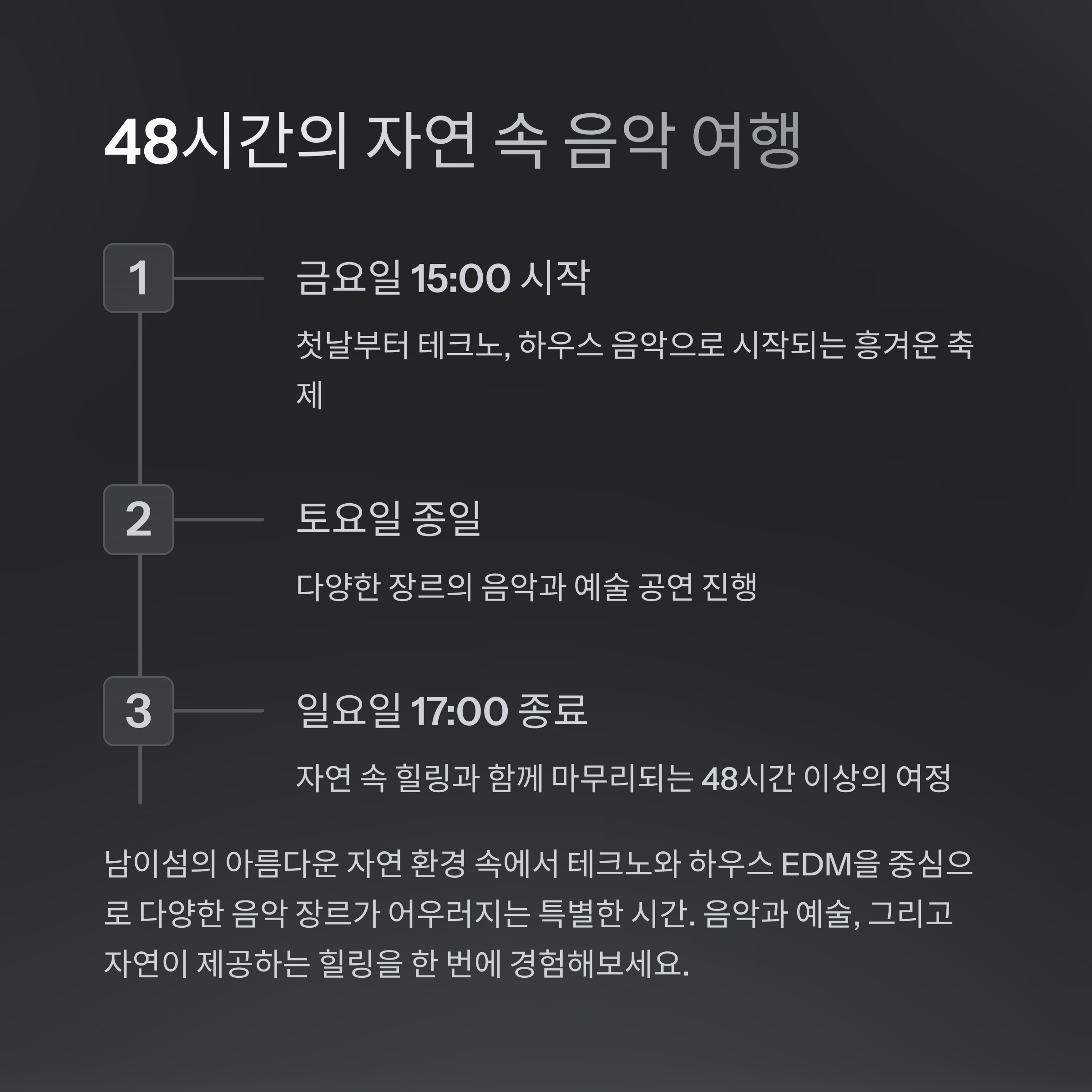 음악을 중심으로 자연, 지역사회, 환경의 가치를 엮은 새로운 형태의 페스티벌이에요. 남이섬이라는 특별한 공간을 배경으로 관객과 아티스트, 로컬 브랜드, 커뮤니티가 함께 만드는 축제인 만큼, 기존 뮤직 페스티벌과는 전혀 다른 감성을 선사합니다. 공연 외에도 친환경 마켓, 미니 전시, 아티스트 토크 등 다양한 부대 프로그램이 펼쳐져 보는 즐거움과 참여하는 재미를 동시에 느낄 수 있어요.