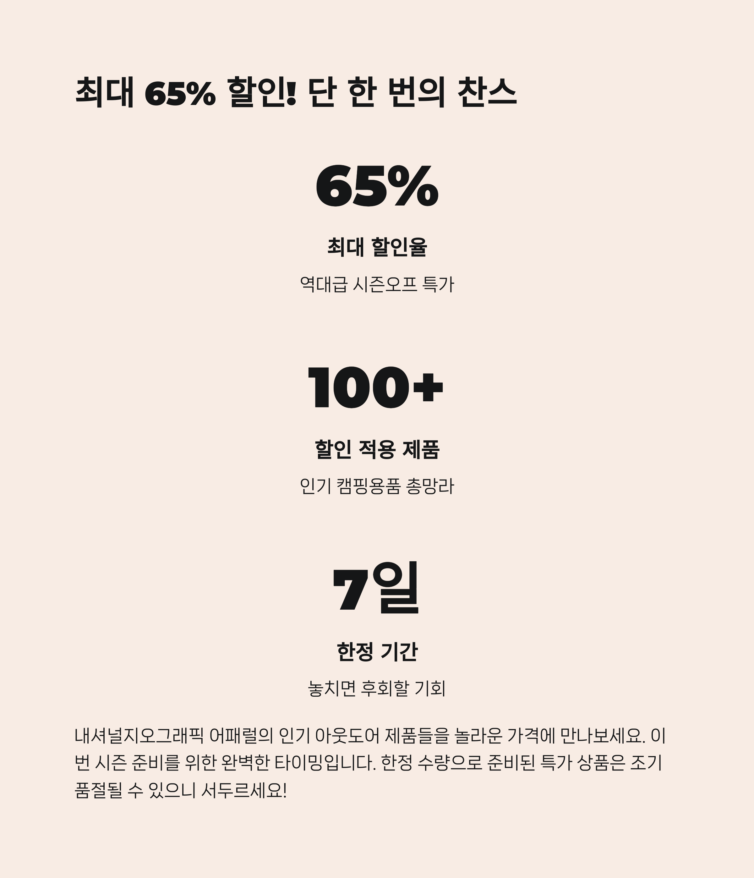 캠핑 시즌을 앞두고 내셔널지오그래픽 어패럴에서 대대적인 할인전을 준비했어요. 바로 N.STATION 단독 기획전 'N-DAY 캠핑템 세일'인데요. 시즌 인기 품목은 물론, 프리미엄 캠핑 텐트와 쉘터까지도 파격적인 가격에 만나볼 수 있는 기회입니다. 행사 종료일은 별도로 공지되지 않았기 때문에, 인기 제품은 조기 품절될 수 있으니 빠른 참여가 필수예요!