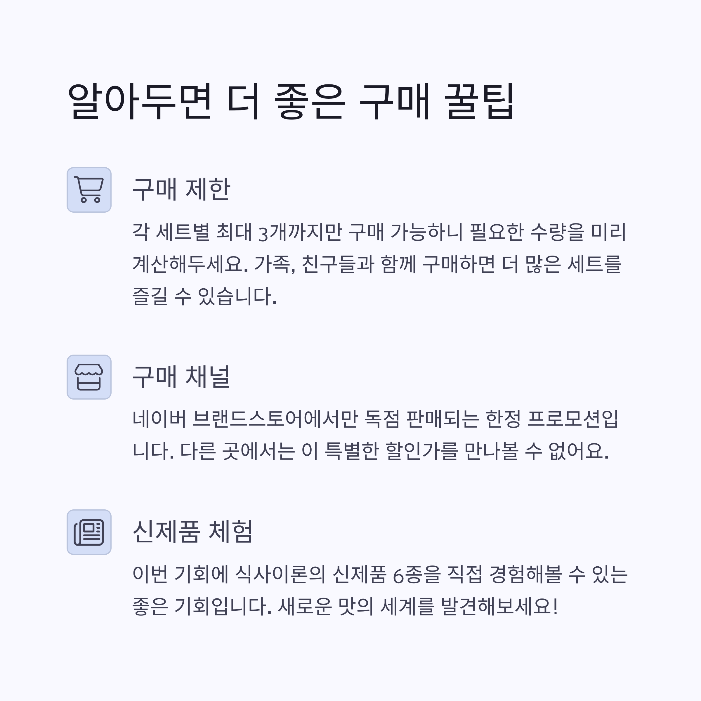 실제로 지난 네고왕 할인 이벤트들도 조기 종료되는 경우가 많았죠. 가장 인기 있는 세트는 ‘식사왕 세트’로, 구성도 풍성하고 가성비가 가장 뛰어납니다. 구매 시엔 최대 3세트까지 주문 가능하니, 가족과 함께 나눌 분이라면 한 번에 확보해두는 것이 좋아요. 또한 네이버페이 결제와 적립 혜택도 함께 챙기는 것도 잊지 마세요!
