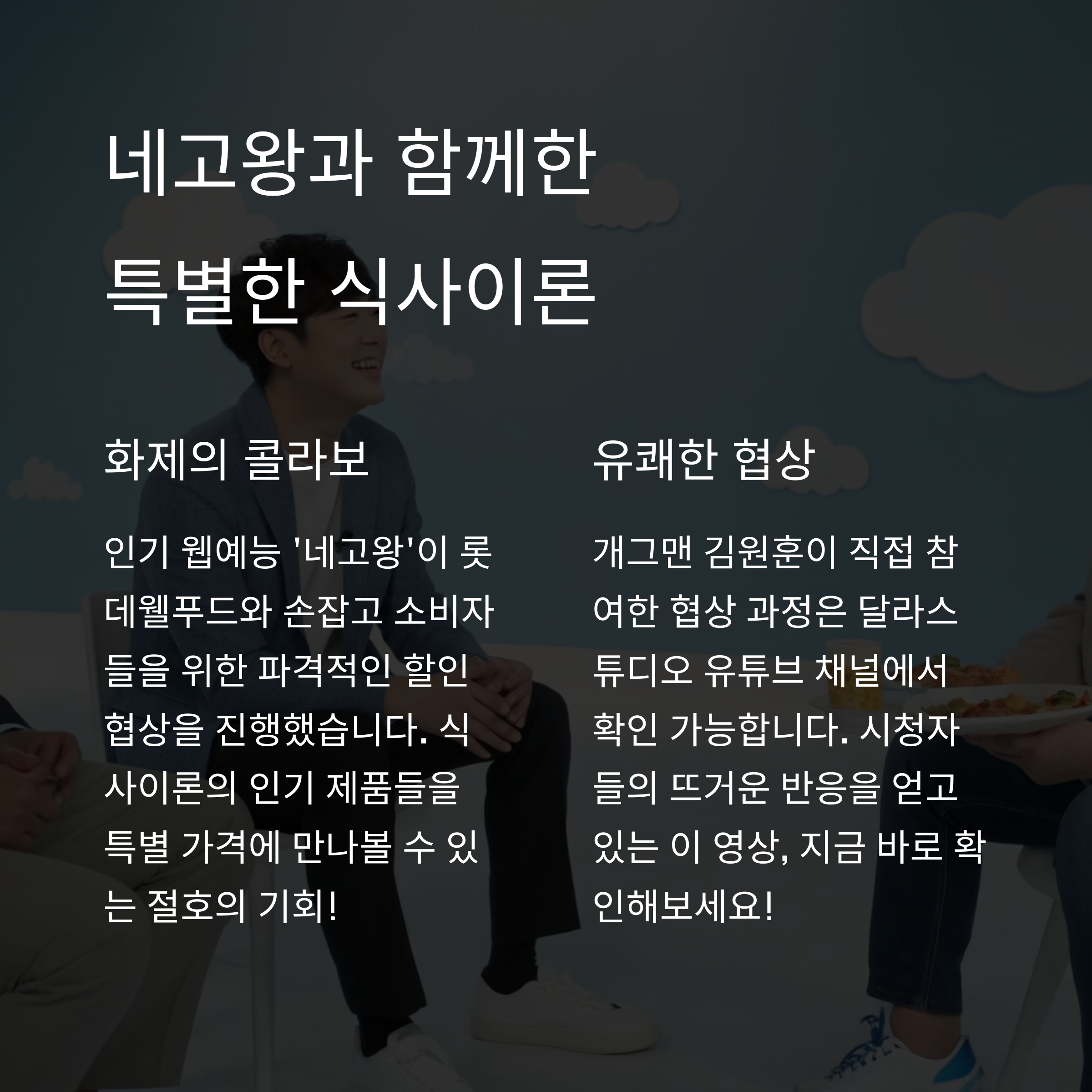 이번 식사이론 회차에서는 새로운 네고왕, 개그맨 김원훈이 등장해 여명랑 부장과의 찐협상으로 진짜 혜택을 따냈습니다. 뻔한 가격 네고가 아니라 구성 자체를 바꿔버리는 레전드 회차로, 유튜브 ‘달라스튜디오’ 채널에서 시청 가능해요. 협상 영상에서 실제 제품 조합과 할인 배경이 소개되니, 보기만 해도 재밌고 유익합니다!