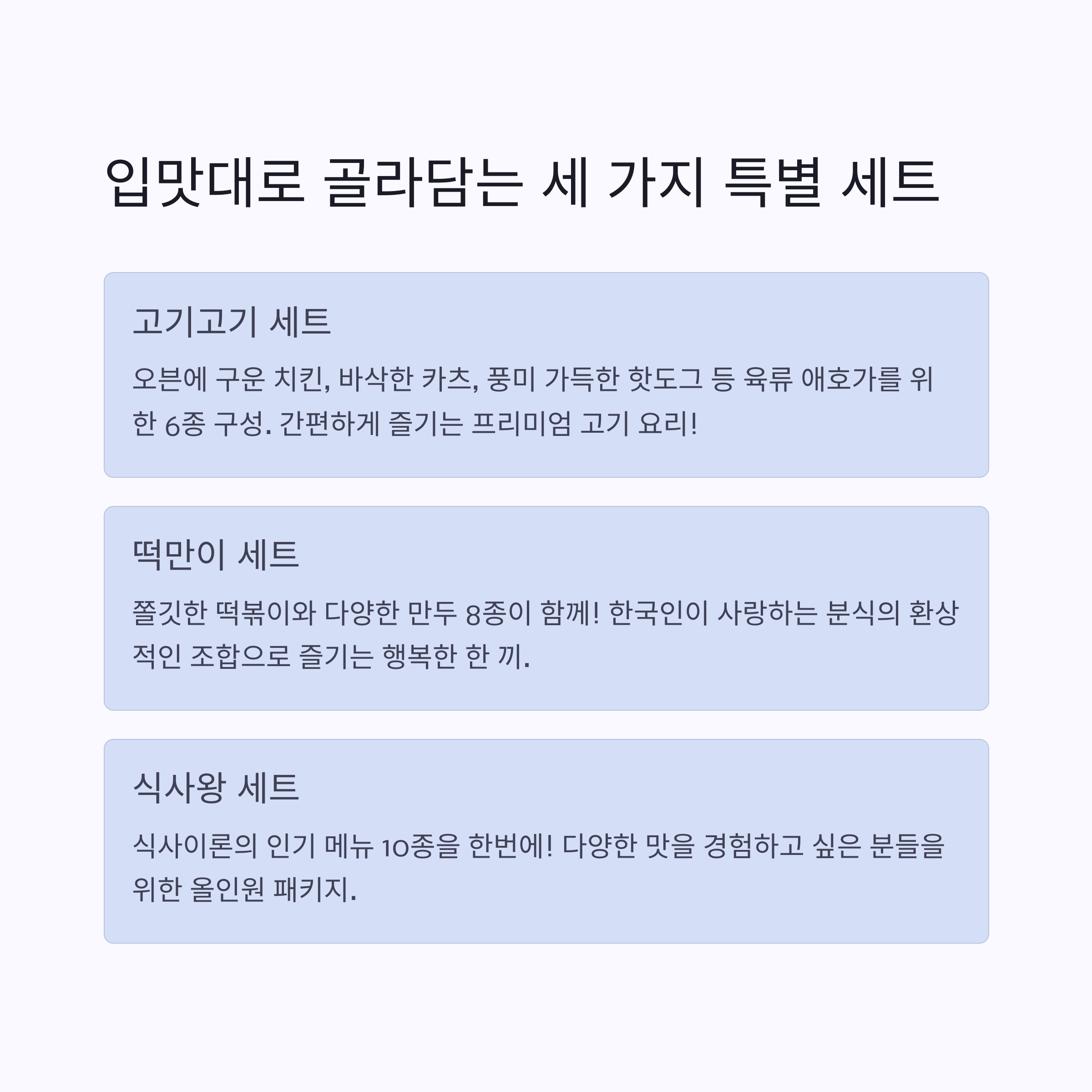 - 식사왕 세트 (10종): 고기, 만두, 떡볶이까지 풀패키지 구성으로 가족용 추천