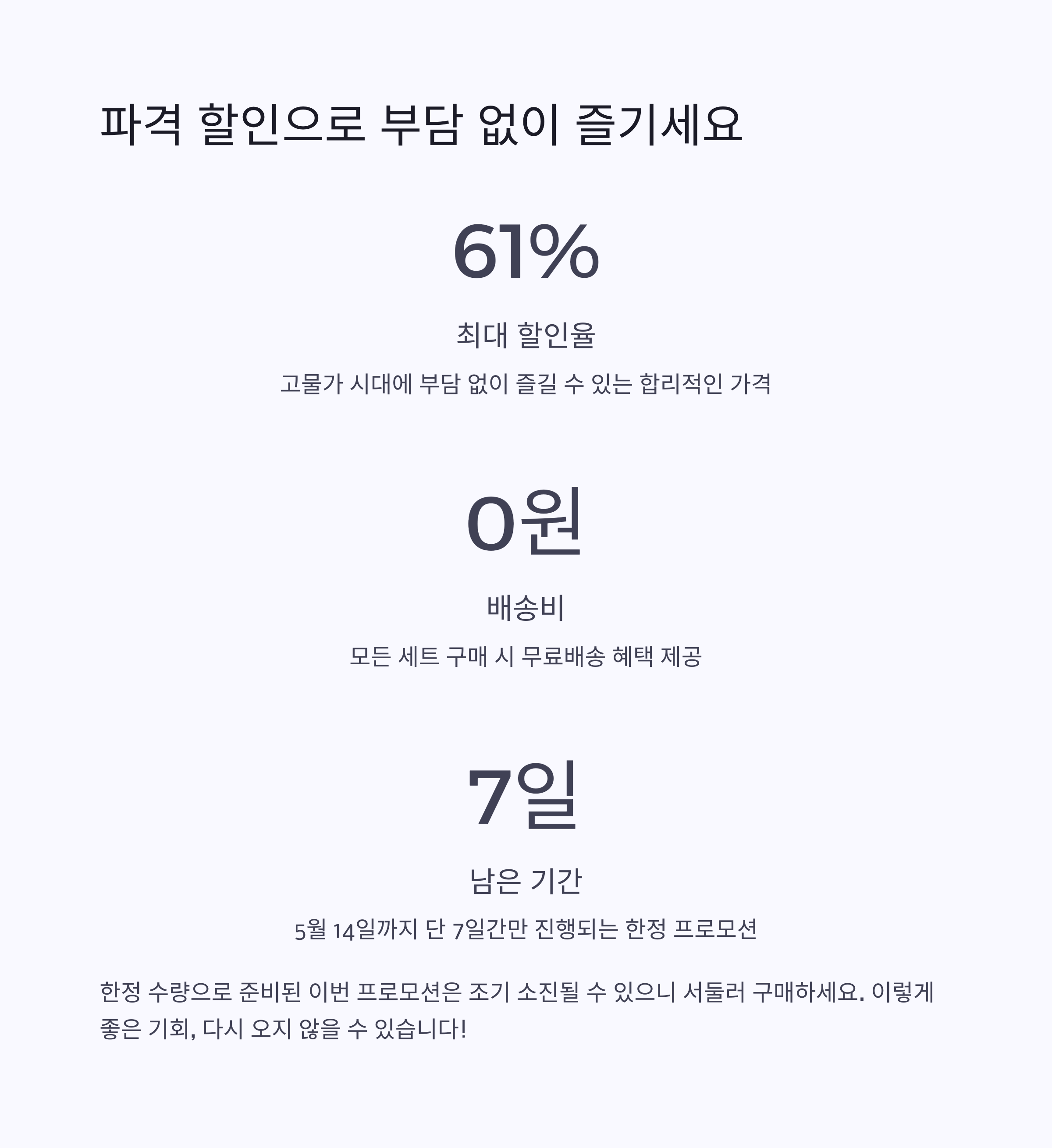 | 배송/수량 | 무료배송 / 상품당 최대 3세트 / 한정 수량 |