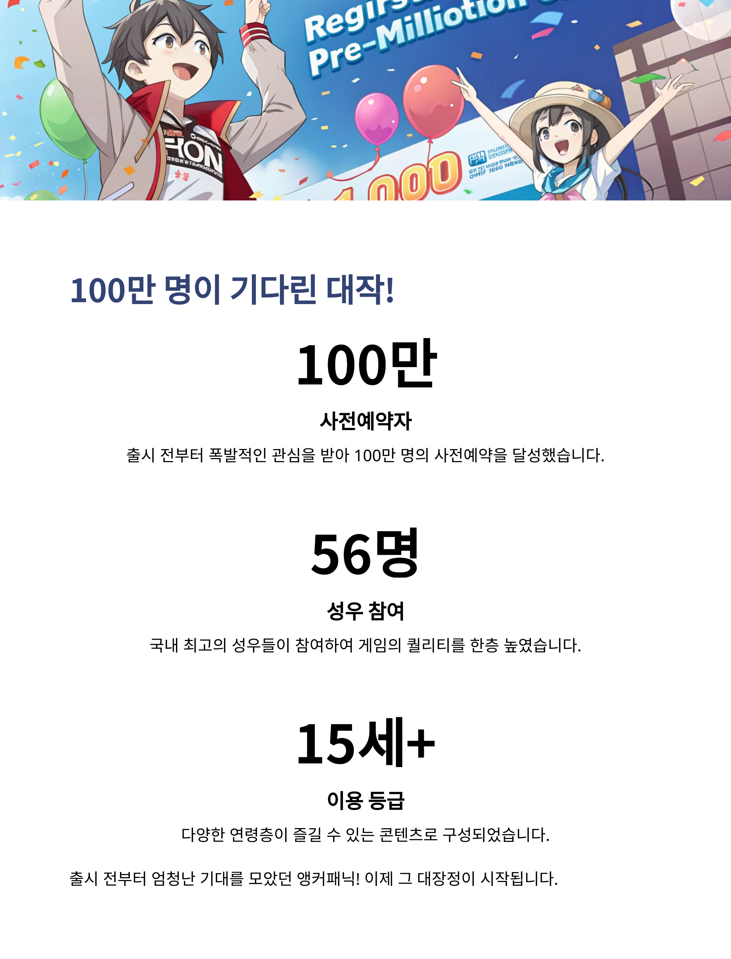 ‘앵커패닉’은 정식 오픈과 동시에 풍성한 혜택을 제공합니다. 사전예약자 100만 명 달성을 기념하여, SSR 등급 캐릭터부터 재화, 전용 의상까지 포함된 럭셔리한 구성의 보상이 배포 중입니다. 게임 접속 후 우편함을 확인하면, 아래와 같은 보상을 즉시 수령할 수 있습니다. 신규 유저에게는 매우 유리한 스타트 구간이니, 꼭 체크하세요!
