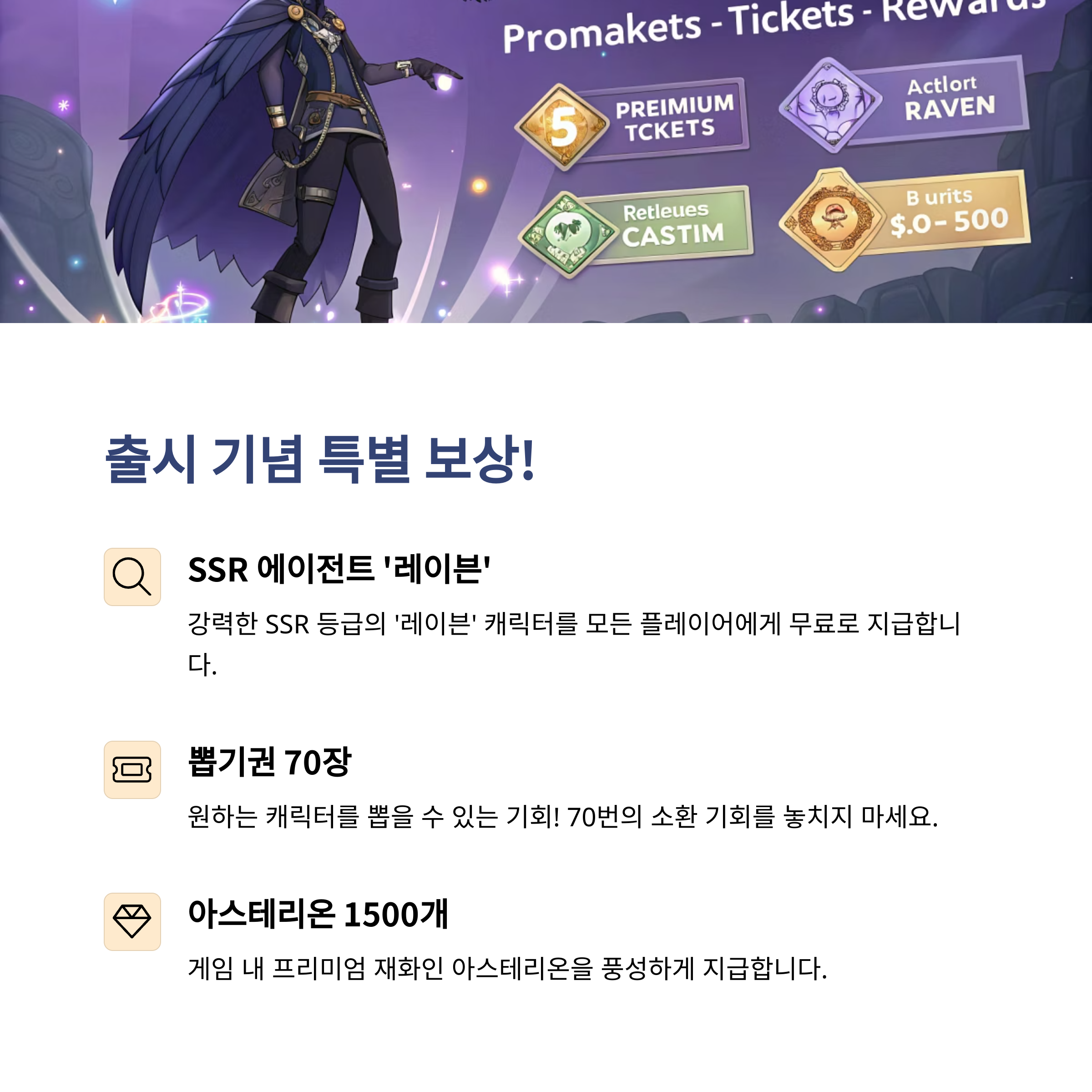 | SSR 캐릭터 | 레이븐 (사전예약 한정 지급) |