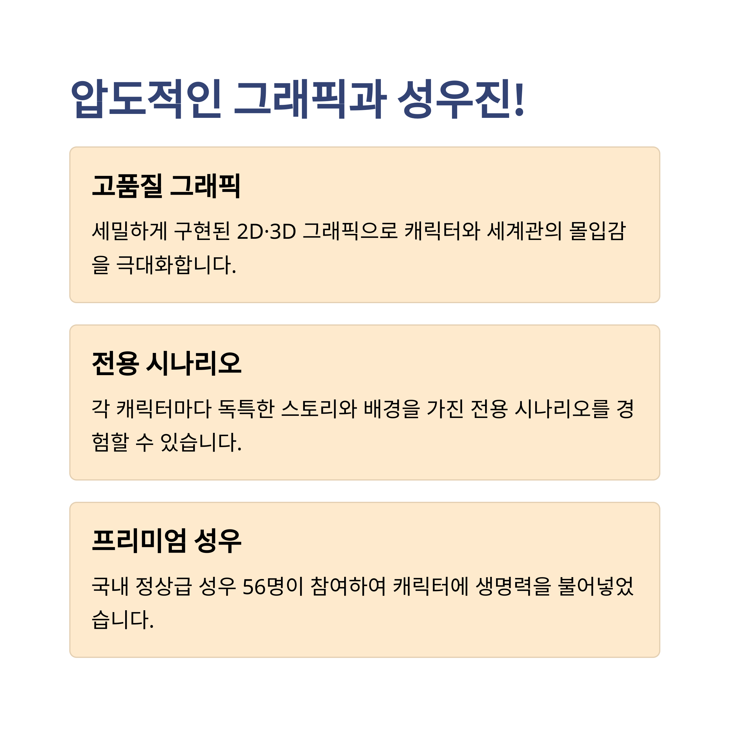 앵커패닉은 총 56명의 국내 성우진이 참여하여 모든 캐릭터의 대사에 생동감을 불어넣고 있습니다. 특히 주요 스토리 구간에는 전용 보이스가 삽입되어 있으며, 전투 중에도 캐릭터 고유 음성이 실시간 출력됩니다. 이외에도 각 캐릭터별 하우징 및 인터랙션 콘텐츠가 마련되어 있어, 단순 수집형 RPG를 넘어 몰입형 콘텐츠로 진화한 모습을 보여줍니다.