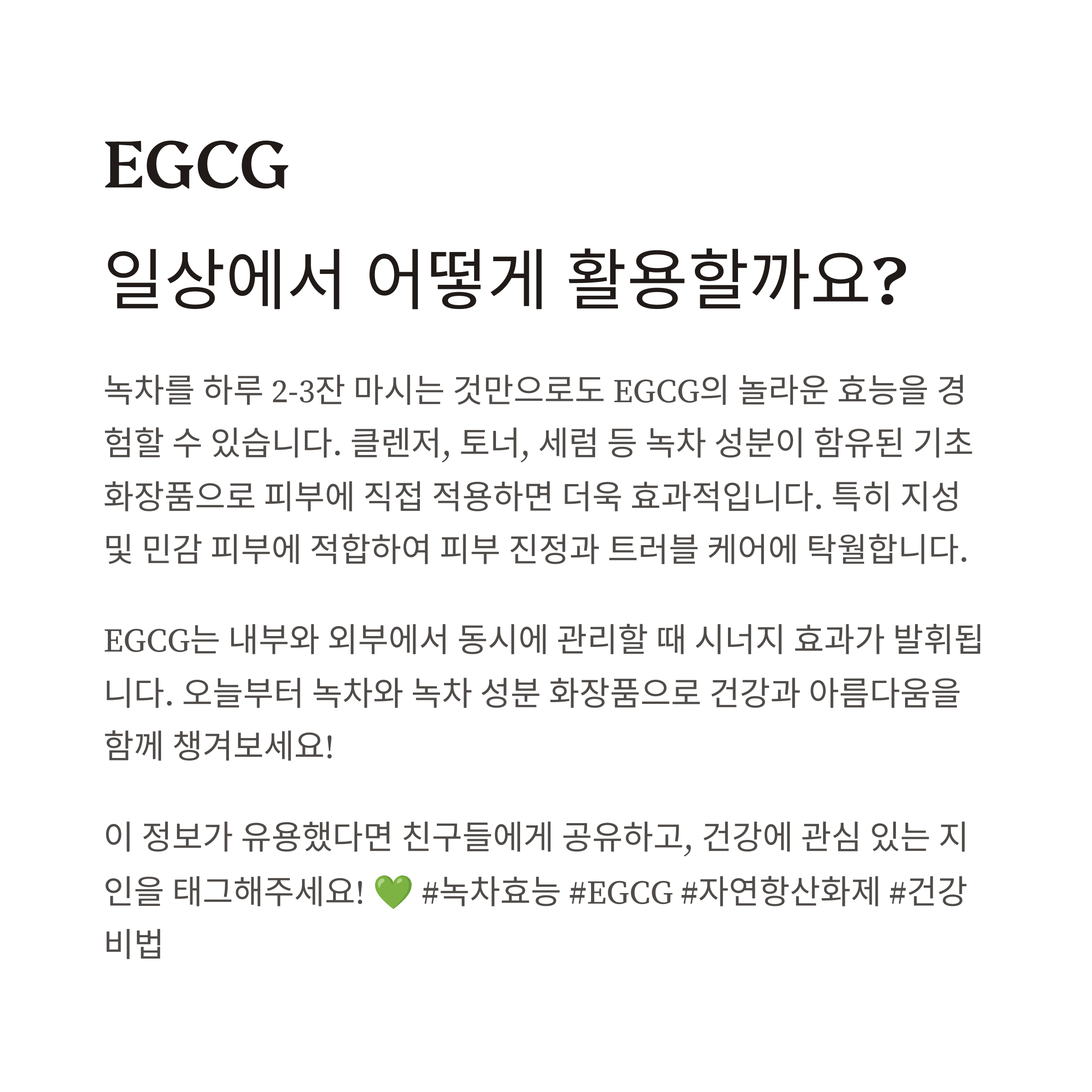 EGCG는 피부에 국한되지 않고 체내 다양한 건강에도 깊은 영향을 미칩니다. 기억력 향상, 심혈관 질환 예방, 다이어트, 심지어 항바이러스 작용까지 다방면에서 활약하죠.