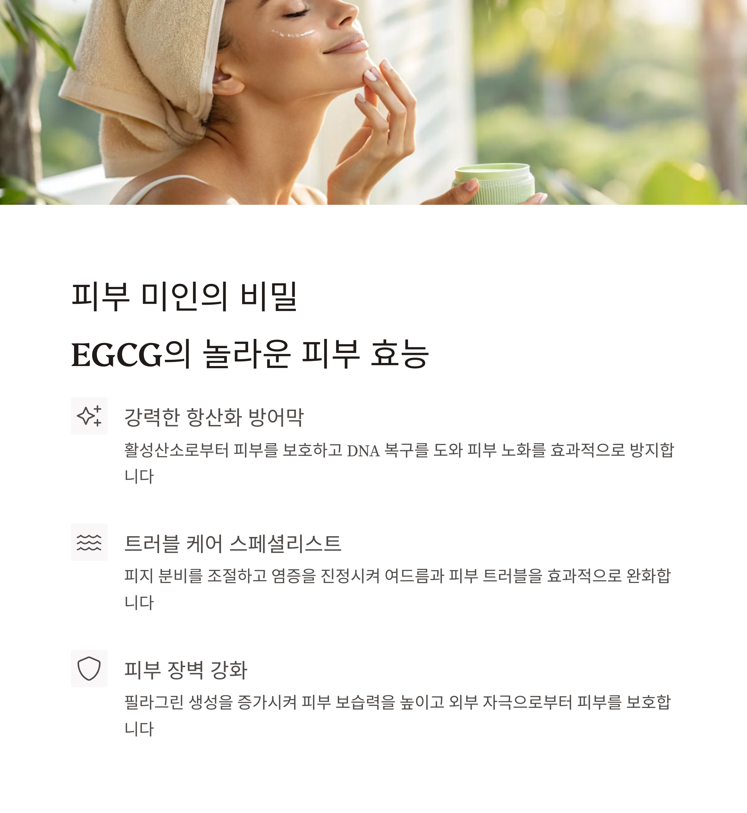 에 즉각 작용하죠. 가장 좋은 방법은 피부에는 녹차 성분 스킨케어, 체내에는 티나 보충제를 병행하는 방식이에요.